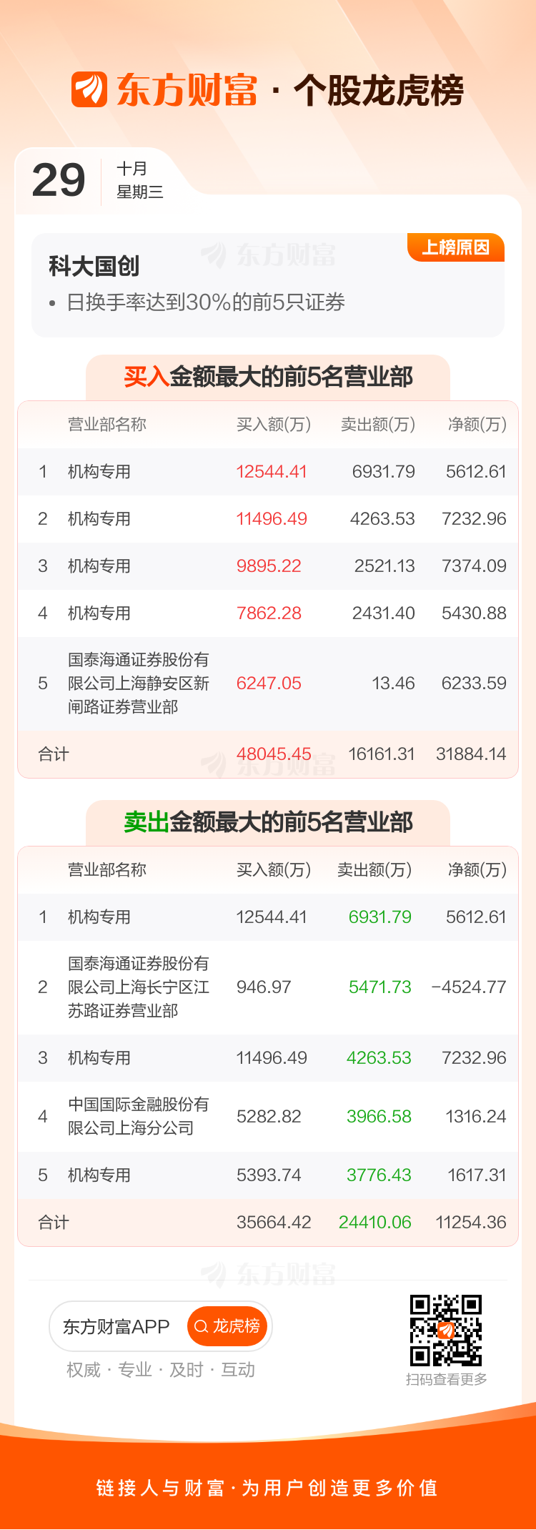 交易所2025年10月29日公布的交易公开信息显示,科大国创因成为日换手率达到30%的前5只证券上榜。科大国创当日收报41.79元,涨跌幅12.64%,偏离值39.81%,换手率39.81%,成交额46.08亿。