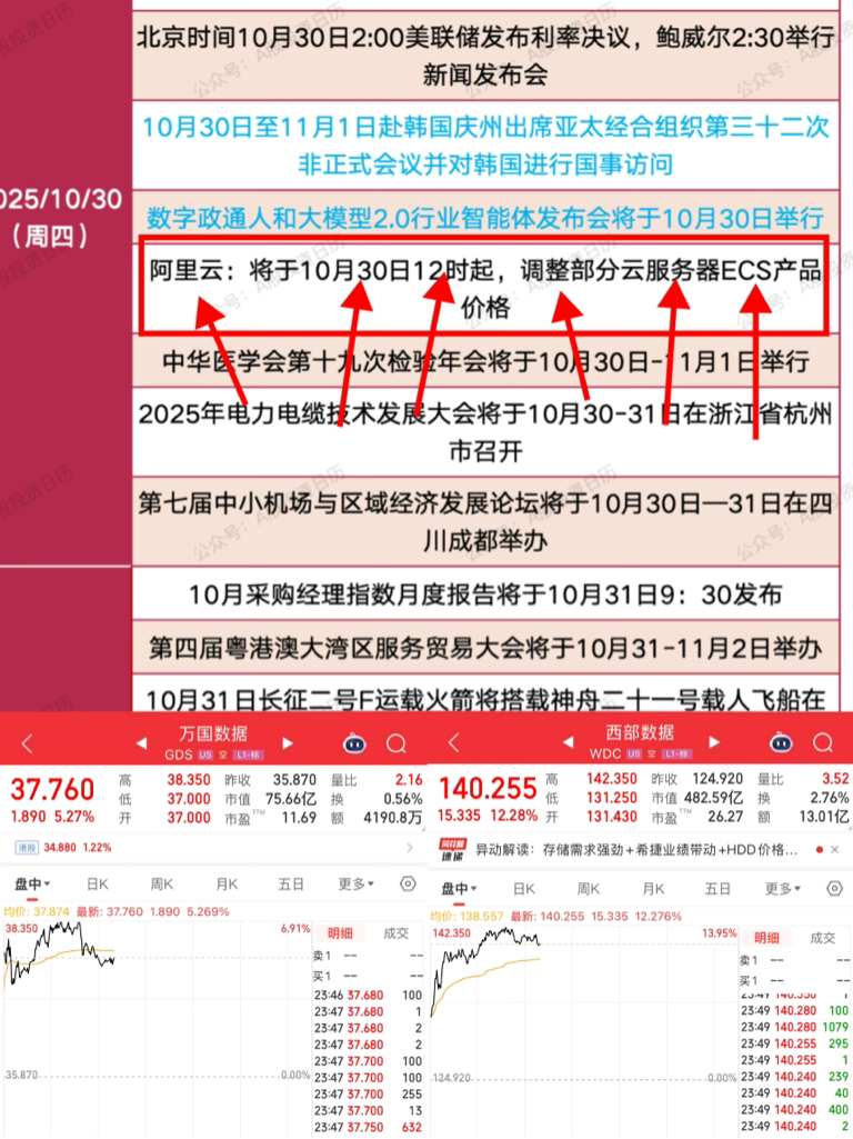 $科大国创(SZ300520)$ 机会……奥飞数据…明天爆发…美股…西部数据…万国数据…跳空大涨…最重磅的是阿里云10.30号ECS数据产品涨价…这次轮到数据中心三剑客……奥飞数据…润泽科技…光环新网……统称…奥润光!