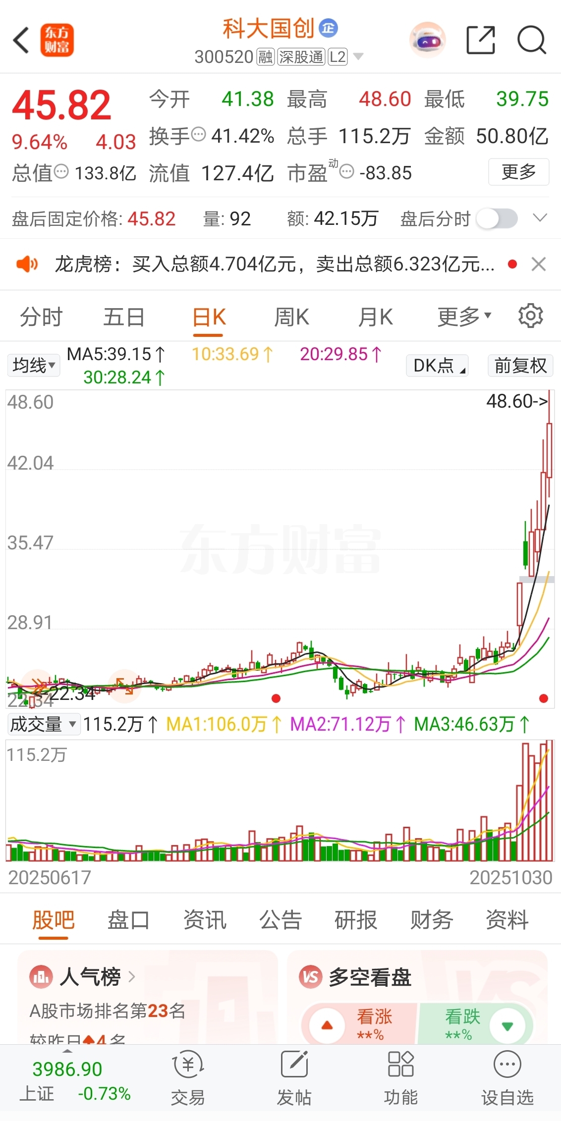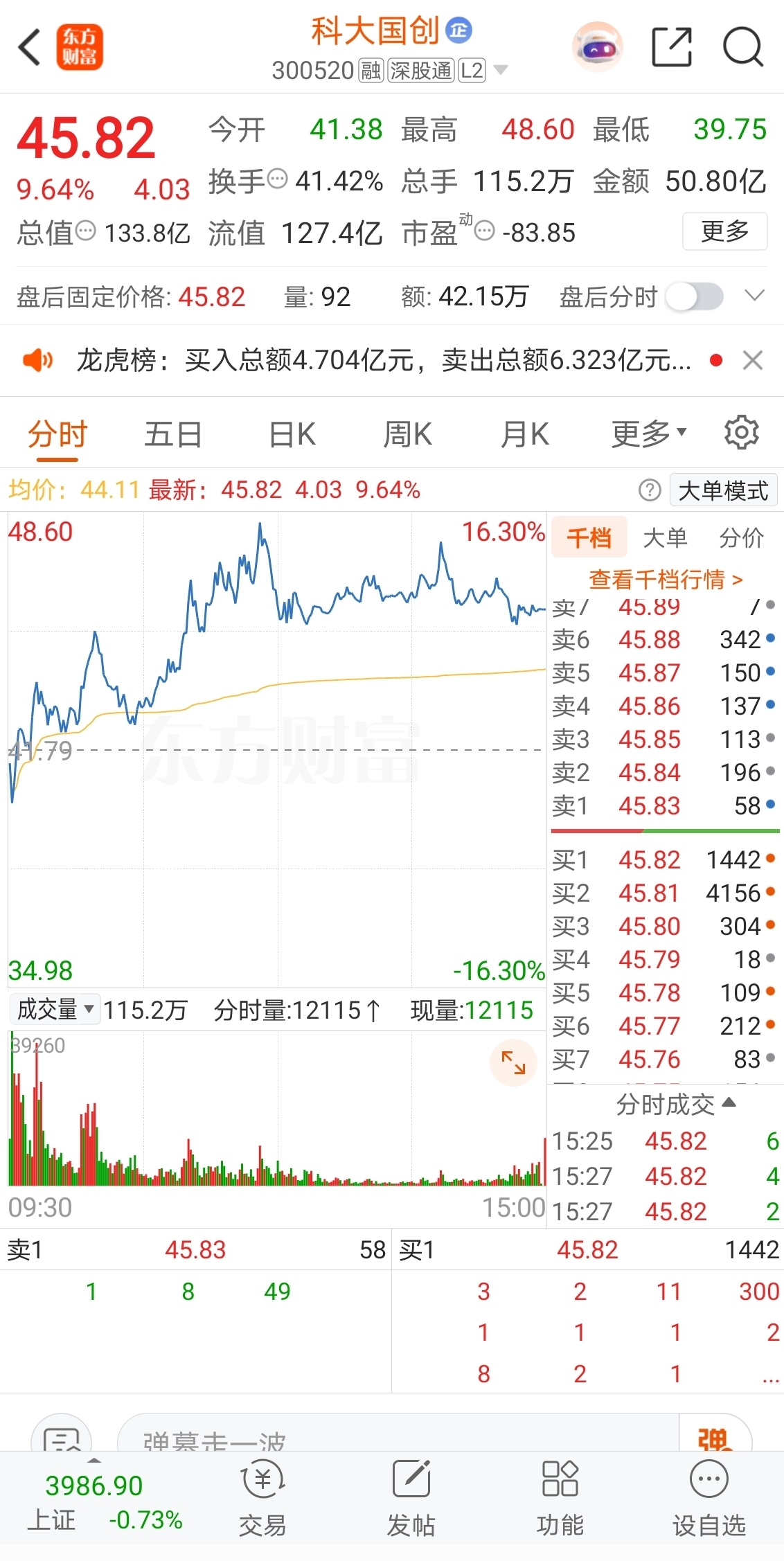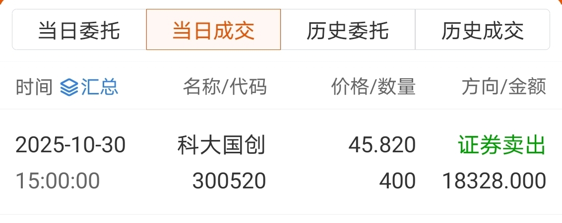 2025-10-30选择在15:00收盘价45.82元卖出。