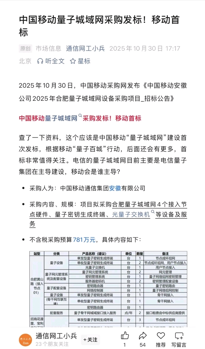 $科大国创(SZ300520)$ 移动已经开始量子招标了