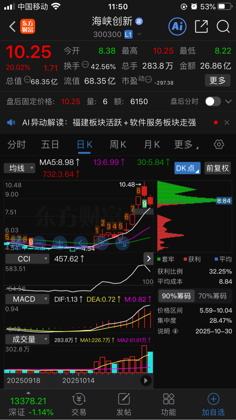 $科大国创(SZ300520)$ 炒股是炒概率 从量能筹码结构看和周四的海峡很相似,只要不破五日线就有希望 五日线做防守