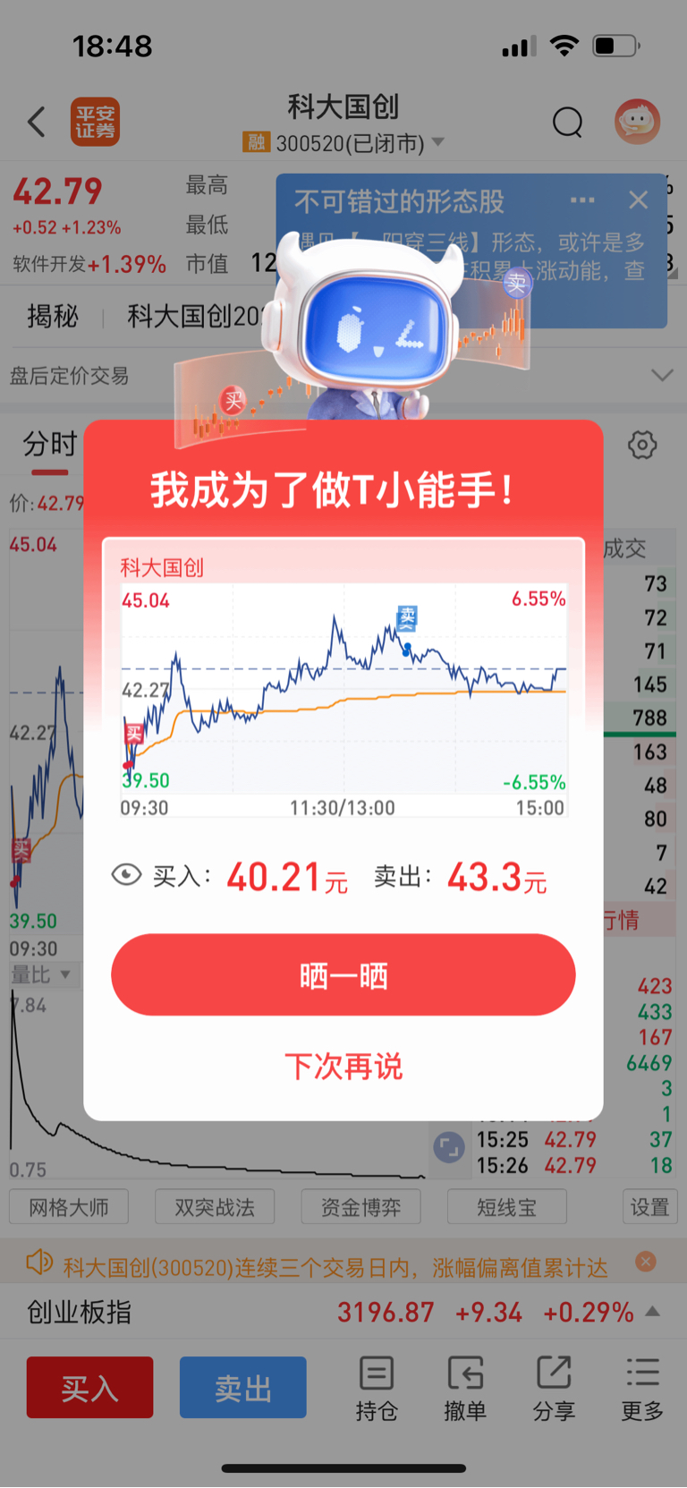 $科大国创(SZ300520)$ 明天继续低吸了,反正不能追高,这票经常早上都在水下4-5个点的观察一段时间了