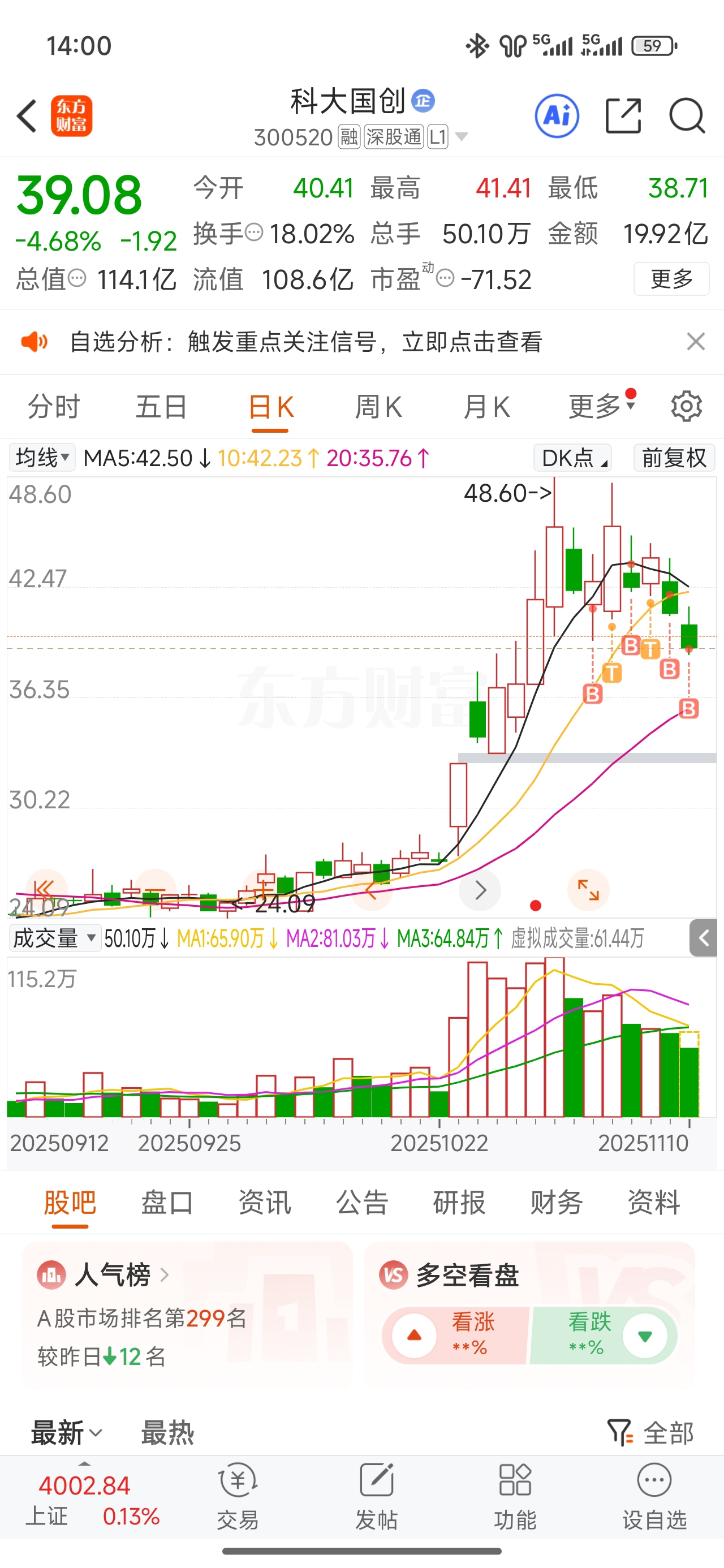 $科大国创(SZ300520)$ 从赚10几个点,到亏2%,继续拿着,看好量子科技
