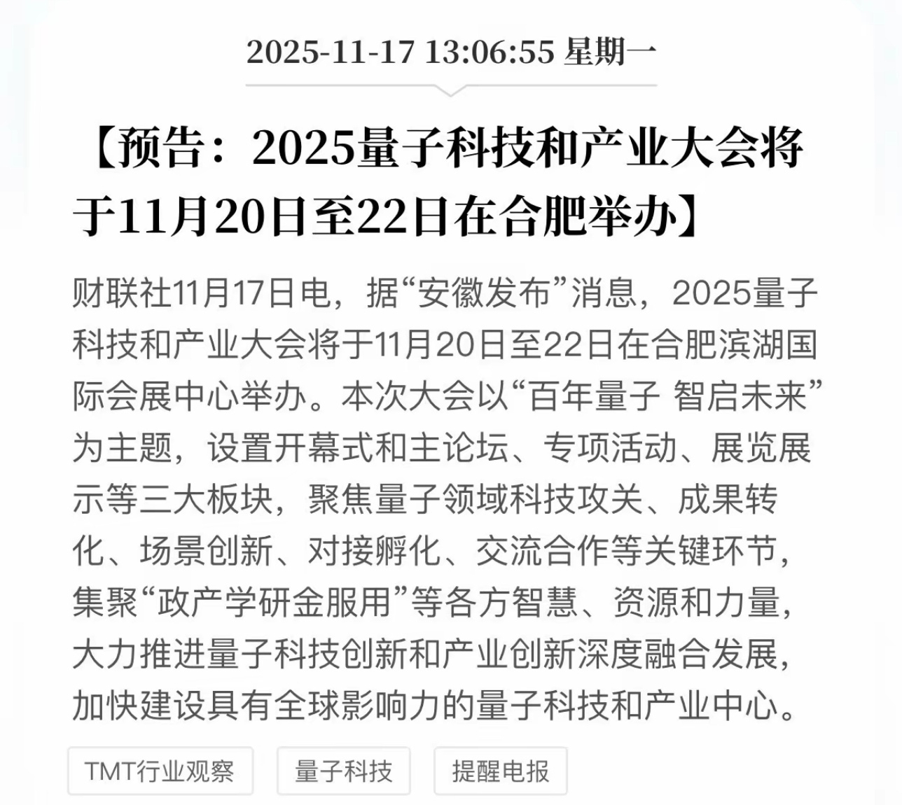 $科大国创(SZ300520)$ 量子产业大会,100亿产业空间。量子要火两天了