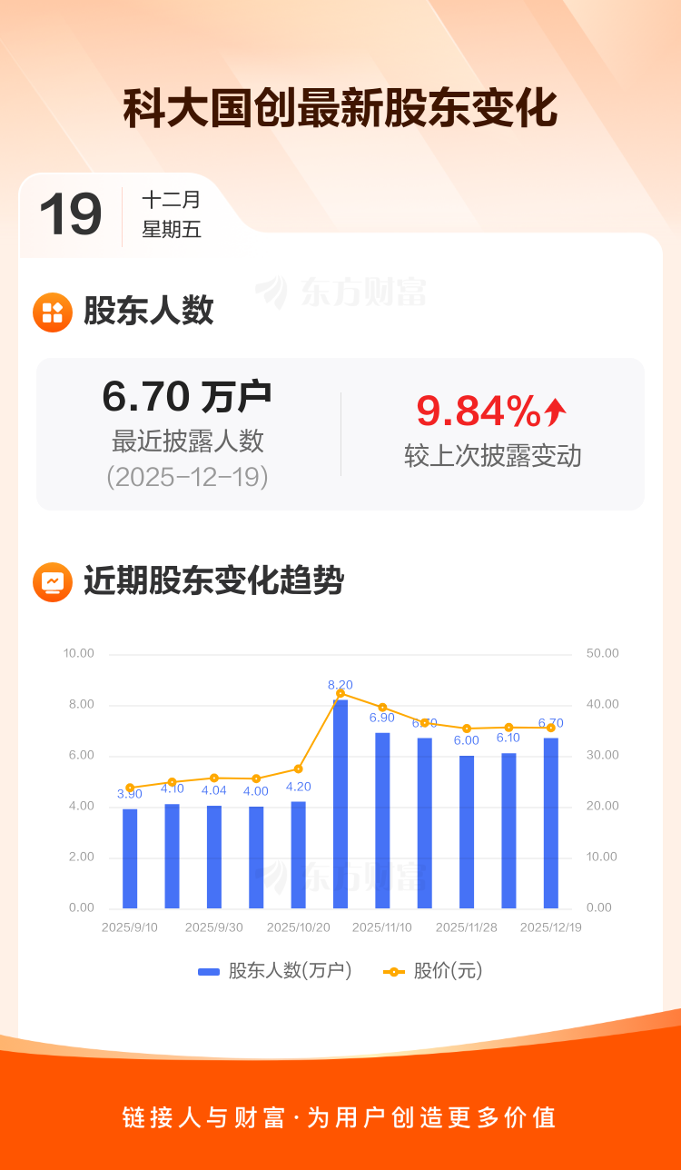 科大国创最新披露数据显示,截至12月19日公司股东户数为6.70万户,较上期(2025年12月10日)增加6000户,增幅为9.84%。户均持有流通股数量由上期的4557股下降至4149股,户均持股金额由上期的16.21万元减少至14.73万元。