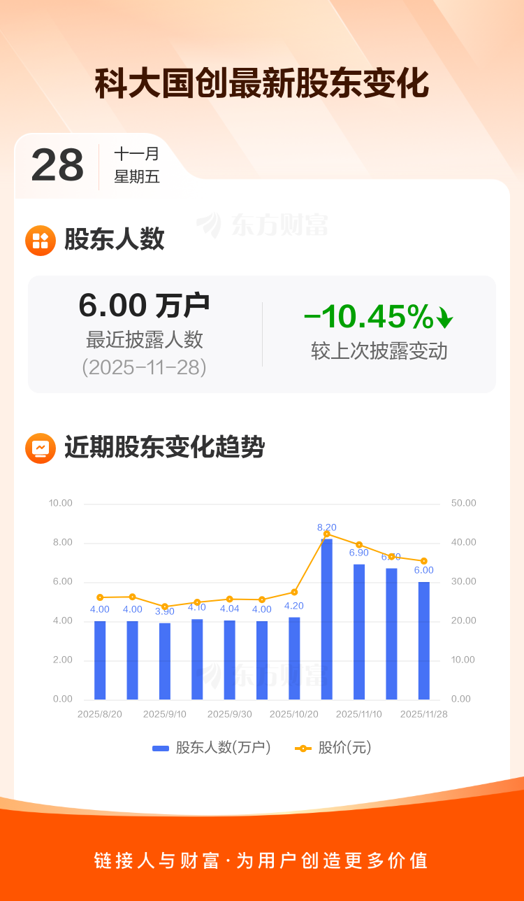 科大国创最新披露数据显示,截至11月28日公司股东户数为6.00万户,较上期(2025年11月20日)减少7000户,降幅为10.45%。户均持有流通股数量由上期的4149股上升至4633股,户均持股金额由上期的15.14万元增加至16.37万元。