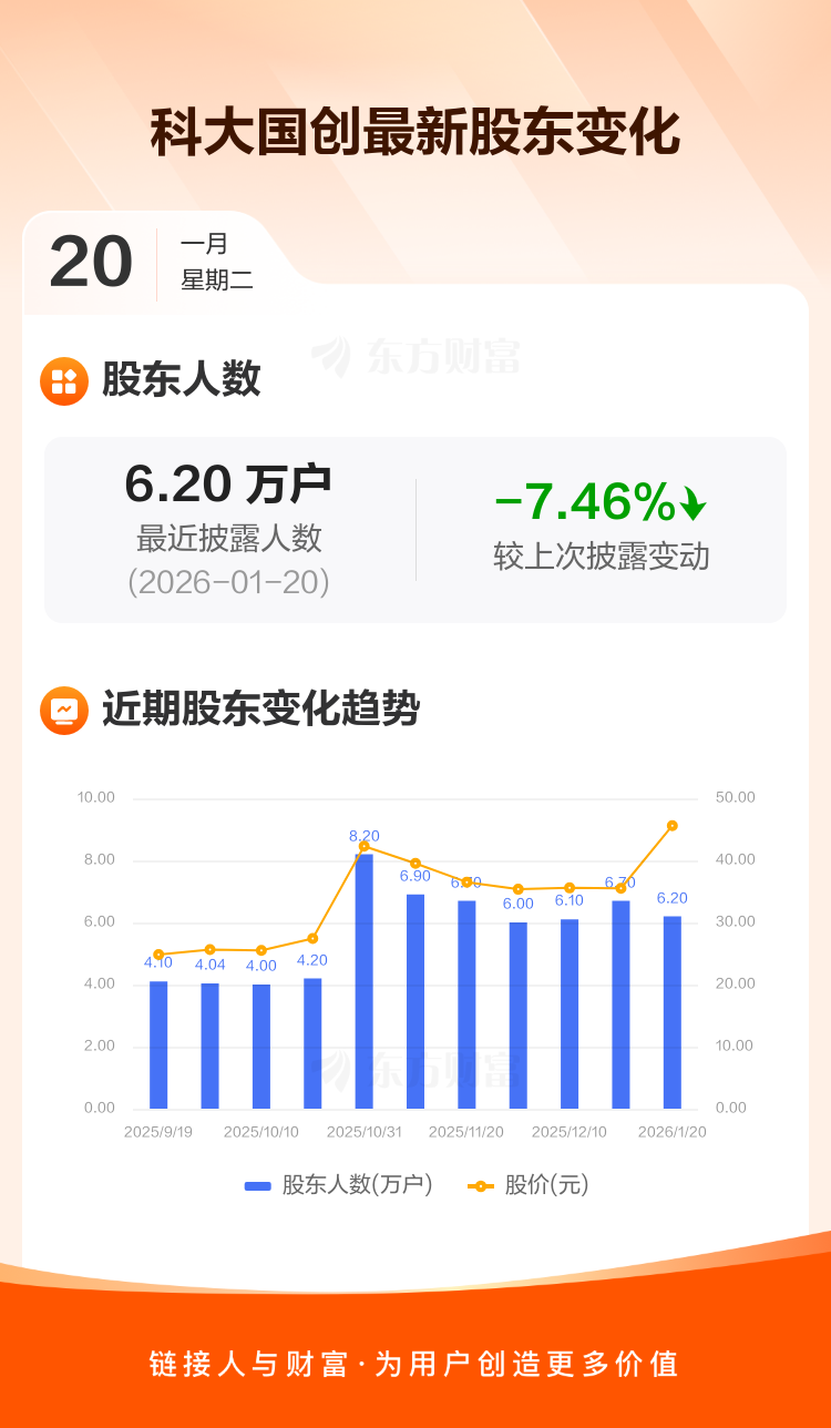 科大国创最新披露数据显示,截至1月20日公司股东户数为6.20万户,较上期(2025年12月19日)减少5000户,降幅为7.46%。户均持有流通股数量由上期的4149股上升至4484股,户均持股金额由上期的14.73万元增加至20.44万元。