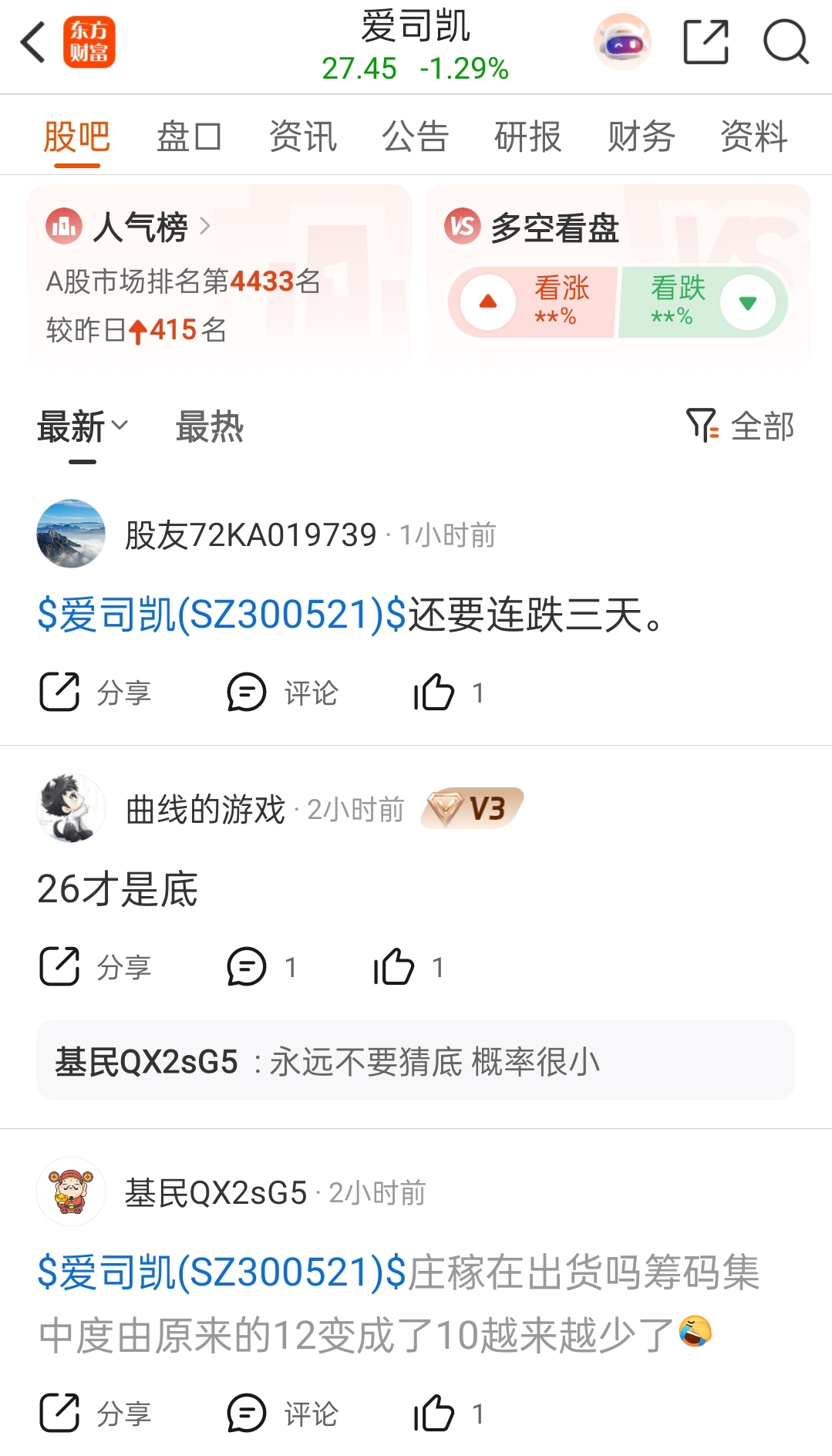 $爱司凯(SZ300521)$ 应该还要盘很久,至少要盘到明年一月份,原因是吧里还有这三个大聪明存在,手里明明拿着仓位却在一本正经看空,啥时这三个大聪明不叨叨了,就是爱司凯要启动了
