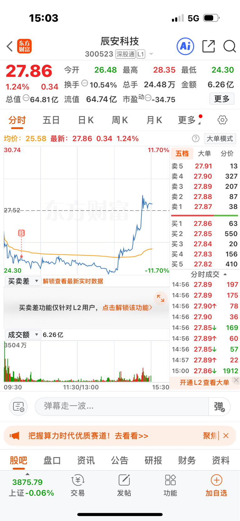 $辰安科技(SZ300523)$ 日内10个点,开心
