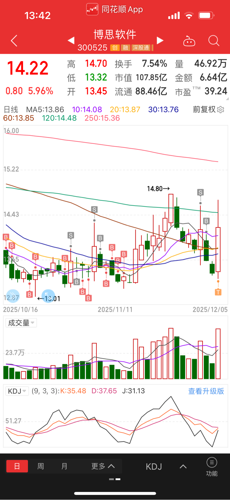$博思软件(SZ300525)$ 我确实一直在做T,但星期五冲高减了,尾盘接回来,几乎满仓状态。现在只能盘中做T,不然轻易卖飞!