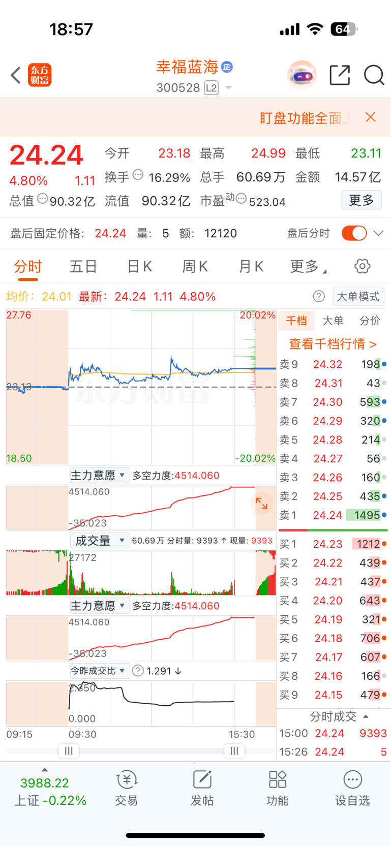 $幸福蓝海(SZ300528)$ 忍了一天没做踢,明天不好好表现就清仓了