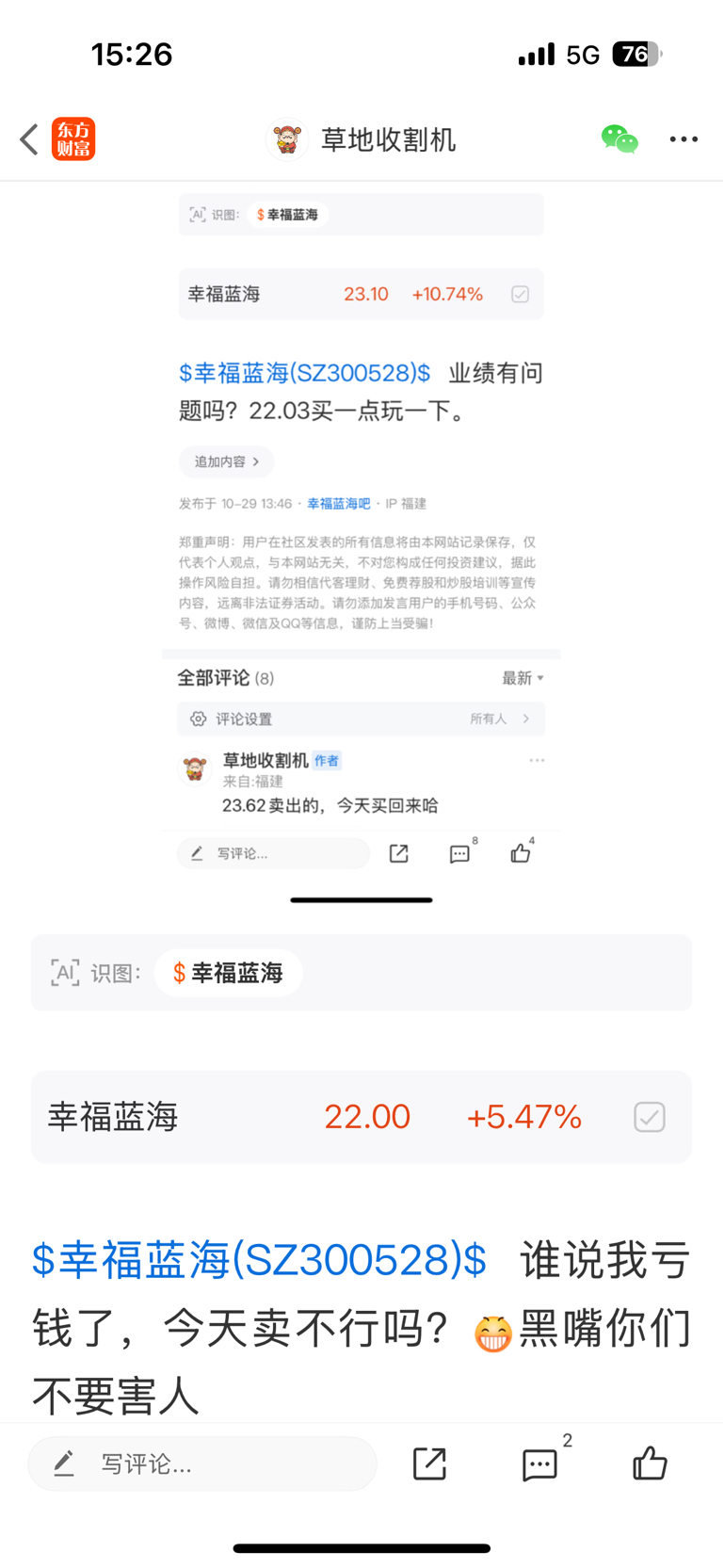 $幸福蓝海(SZ300528)$ 23.1卖完就发帖了,收盘一看盘中富贵,12个点的振幅,这个股如果你不会做踢就被主力拿捏。