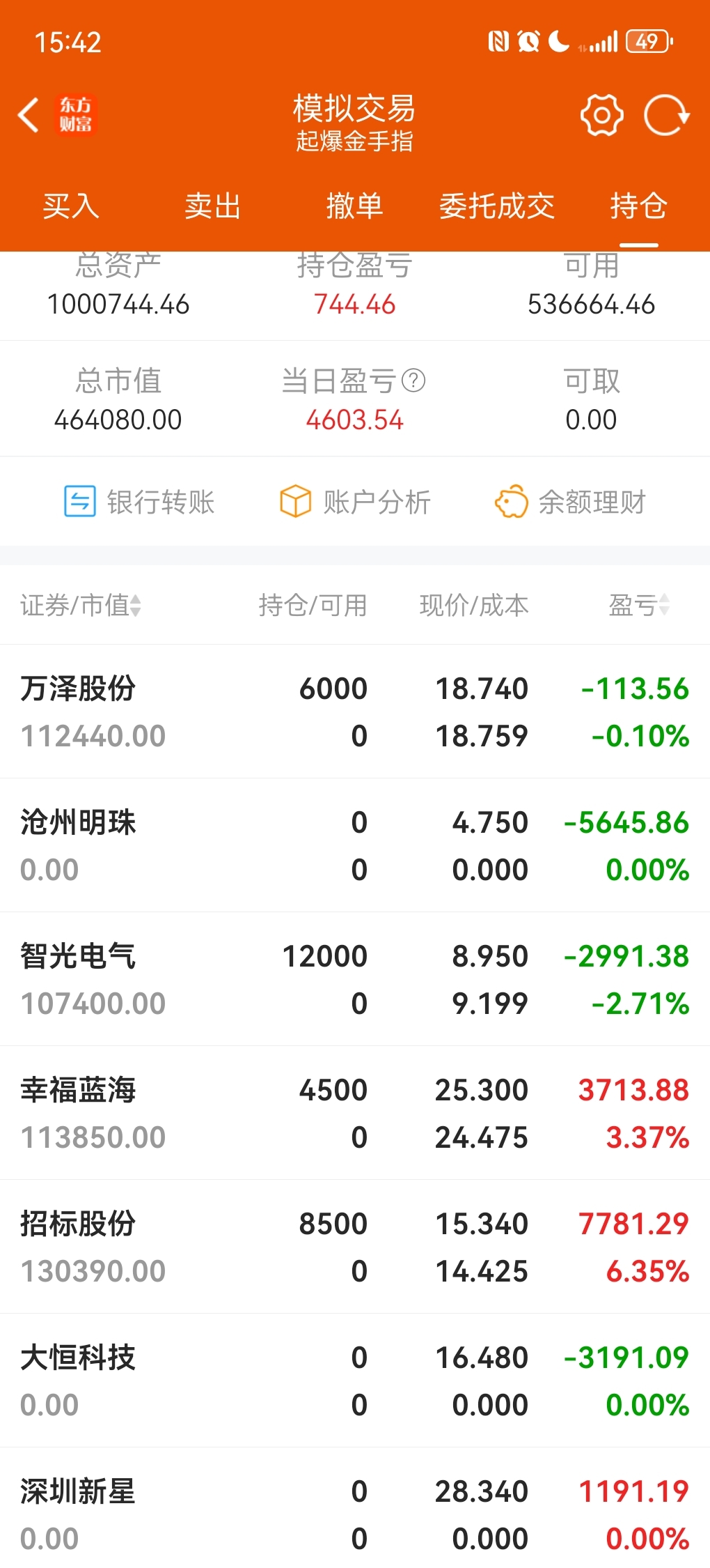 我在东方财富模拟炒股大赛中〈第二天〉,采用起爆点选股逻辑搭配配套金手指,只要前一天标的触发“金手指”信号,就直接执行模拟建仓。