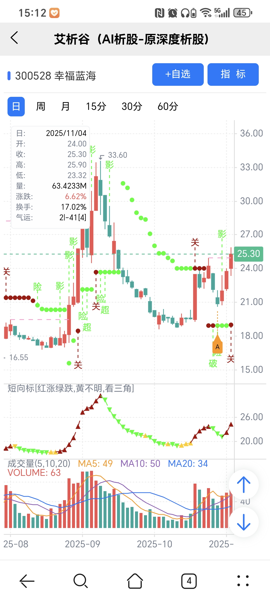 红绿小圆点是艾析谷的量化指标-超级短趋线,是趋势跟踪+突破类的量化指标,完全免费。