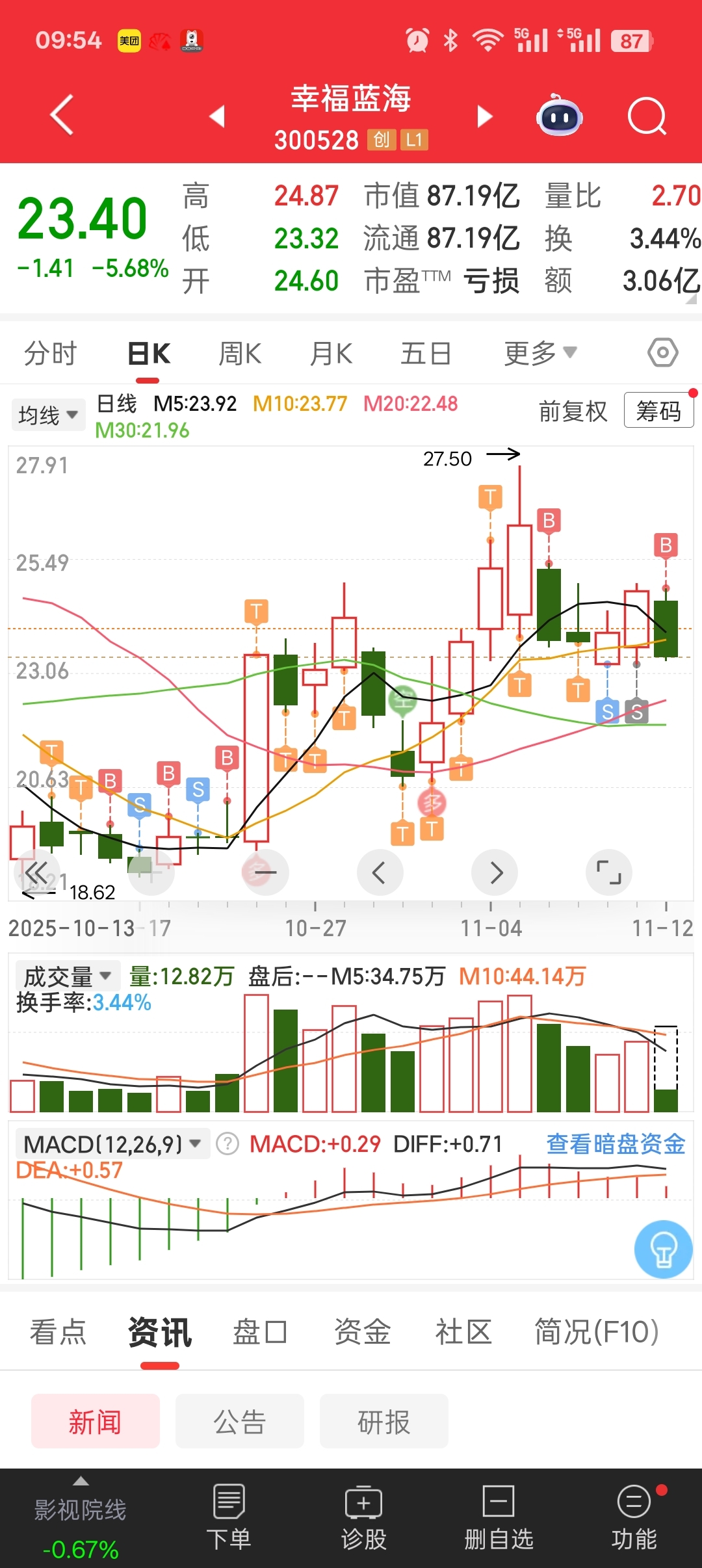 $幸福蓝海(SZ300528)$ 24块把昨天24块5卖的接回来了,看样子明天还要跌。应该要跌到支撑线。