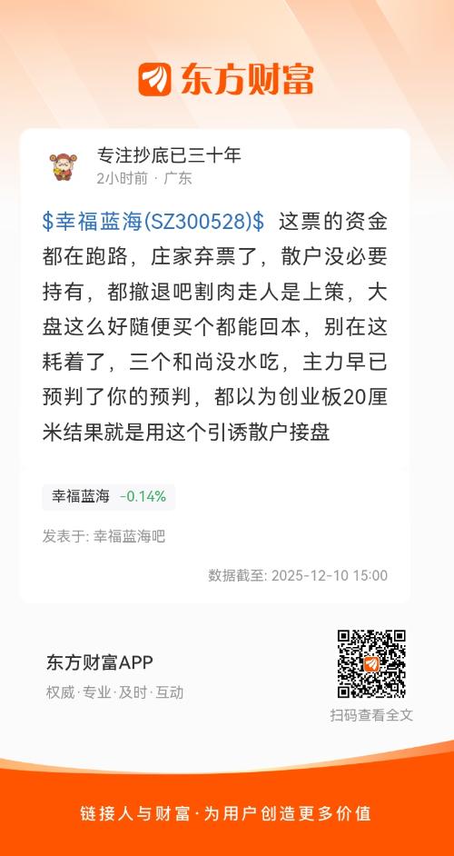 $幸福蓝海(SZ300528)$ 这票的资金都在跑路,庄家弃票了,散户没必要持有,都撤退吧割肉走人是上策,大盘这么好随便买个都能回本,别在这耗着了,三个和尚没水吃,主力早已预判了你的预判,都以为创业板20厘米结果就是用这个引诱散户接盘