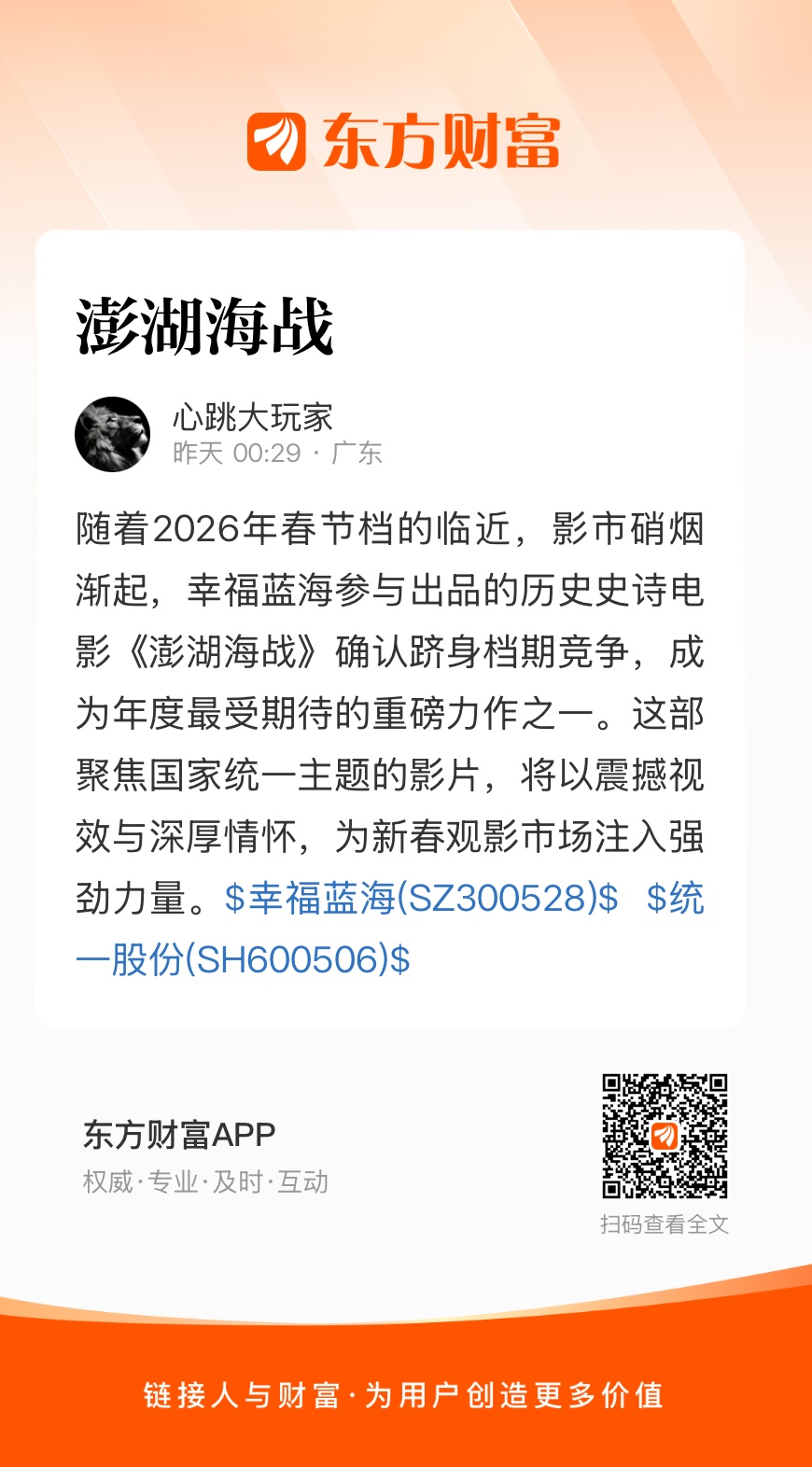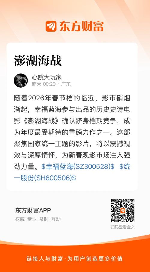 随着2026年春节档的临近,影市硝烟渐起,幸福蓝海参与出品的历史史诗电影《澎湖海战》确认跻身档期竞争,成为年度最受期待的重磅力作之一。这部聚焦国家统一主题的影片,将以震撼视效与深厚情怀,为新春观影市场注入强劲力量。$幸福蓝海(SZ300528)$ $统一股份(SH600506)$