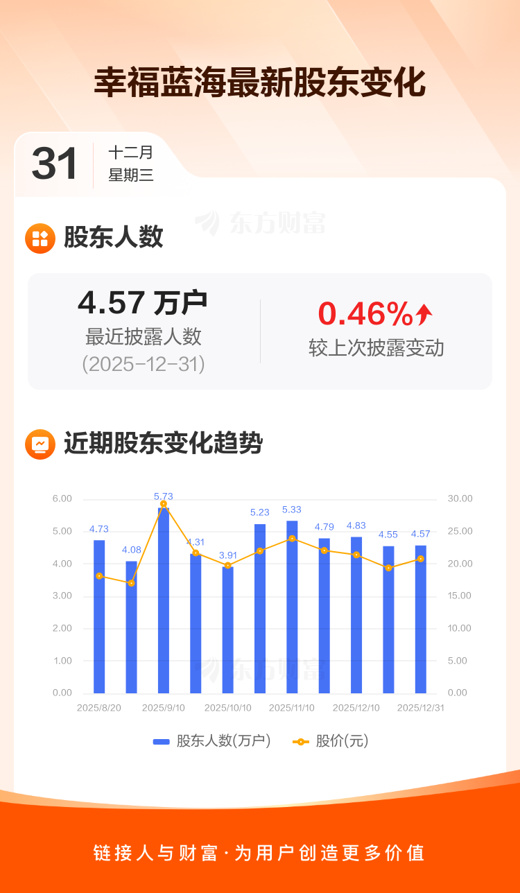幸福蓝海:截至12月31日最新股东户数4.57万户,较上期增加0.46%