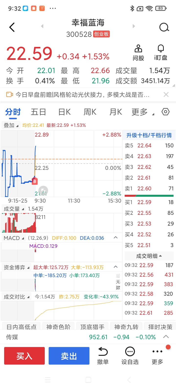 $幸福蓝海(SZ300528)$ 开盘加仓,请高手指点一下现在卖不卖?
