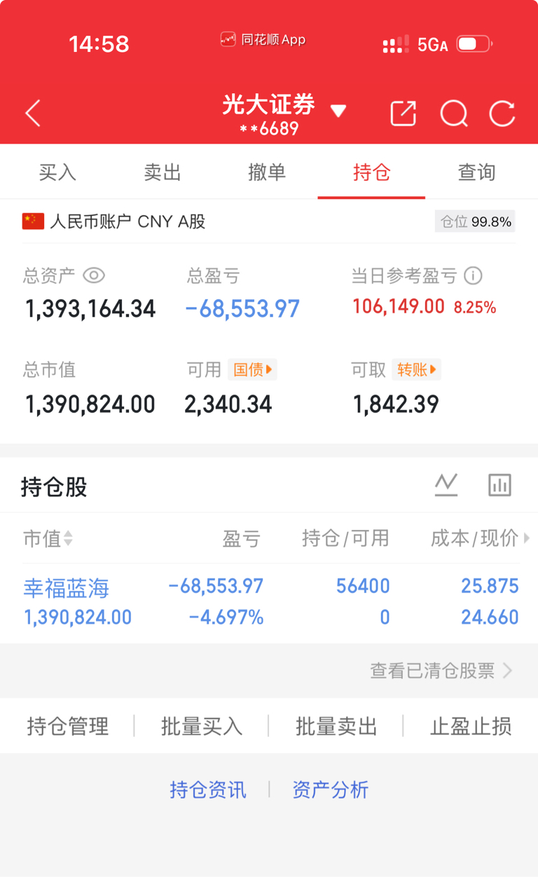 各位股友,$幸福蓝海(SZ300528)$ 今天我冲高3个点卖出,跌1个点全仓接回,一顿操作直接回血10.61万!虽然目前账户还小亏6.85万,但这个成绩我已经很满意了。