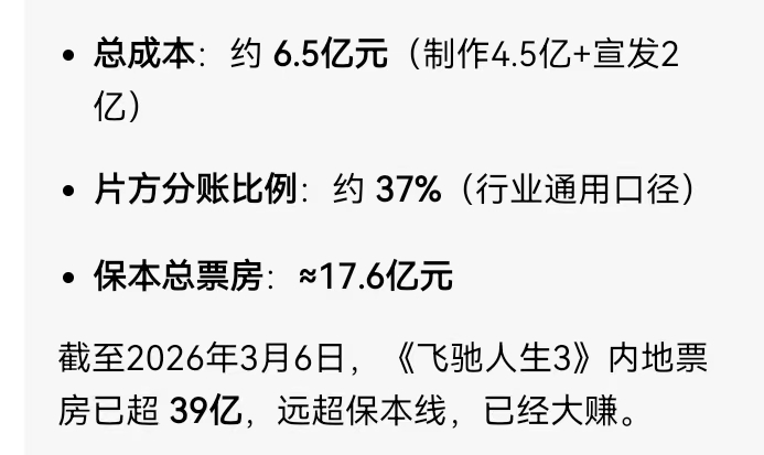 截至2026年3月6日,《飞驰人生3》内地票房已超39亿,远超保本线,已经大赚。