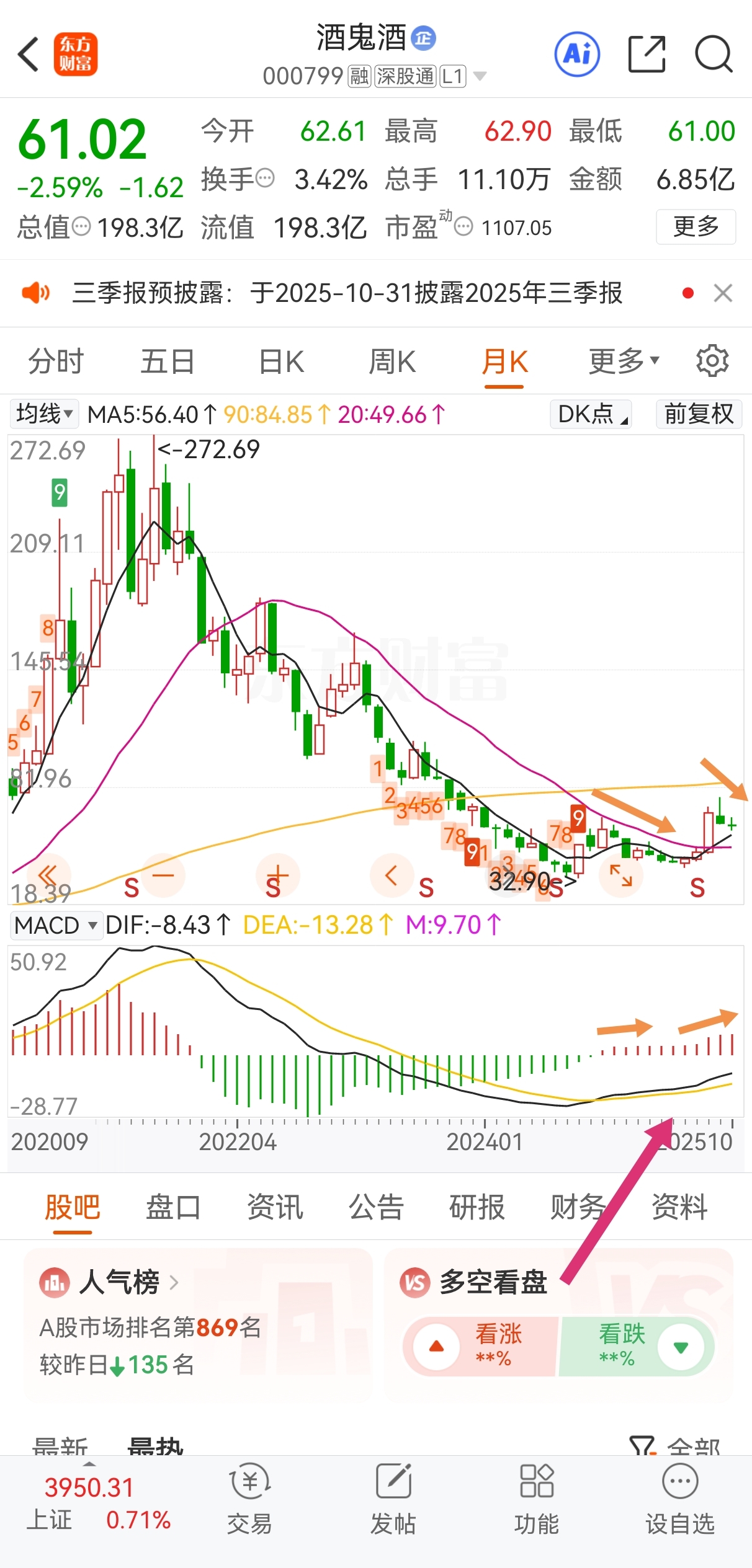 目前这个股进场位置不好,位置不好是买了容易下跌。2025.11.15左右,按照白酒机构进场的时间,会有一个绝佳的进场位置,这个位置不在乎股价高低,就是买了容易涨。