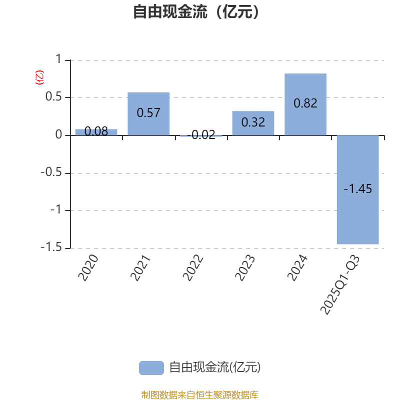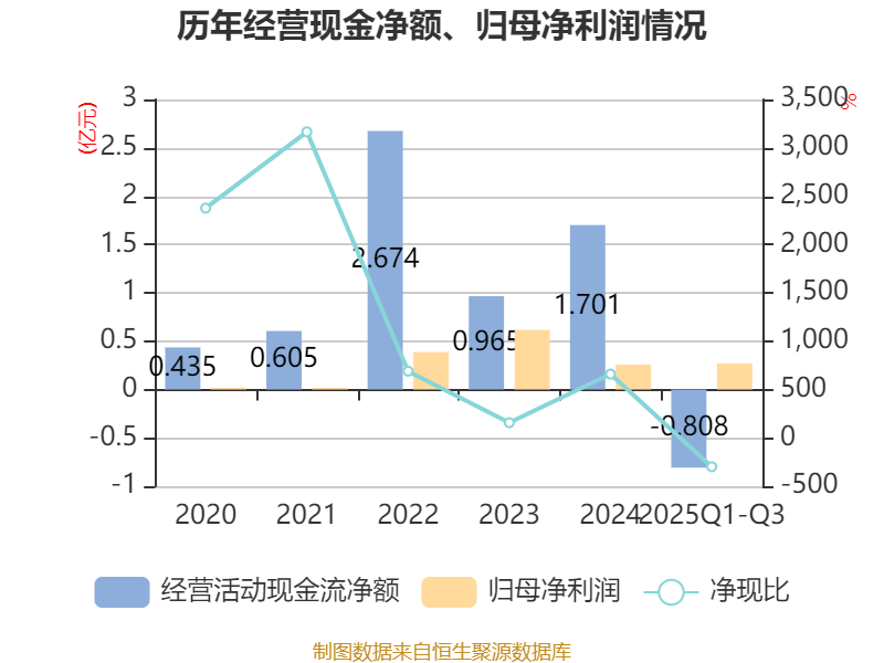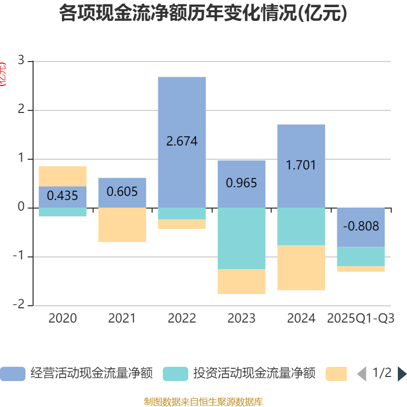 2025年前三季度,公司经营活动现金流净额为-8081.57万元,同比减少2.91亿元;筹资活动现金流净额-1113.24万元,同比增加1.18亿元;投资活动现金流净额-3942.84万元,上年同期为-5480.53万元。