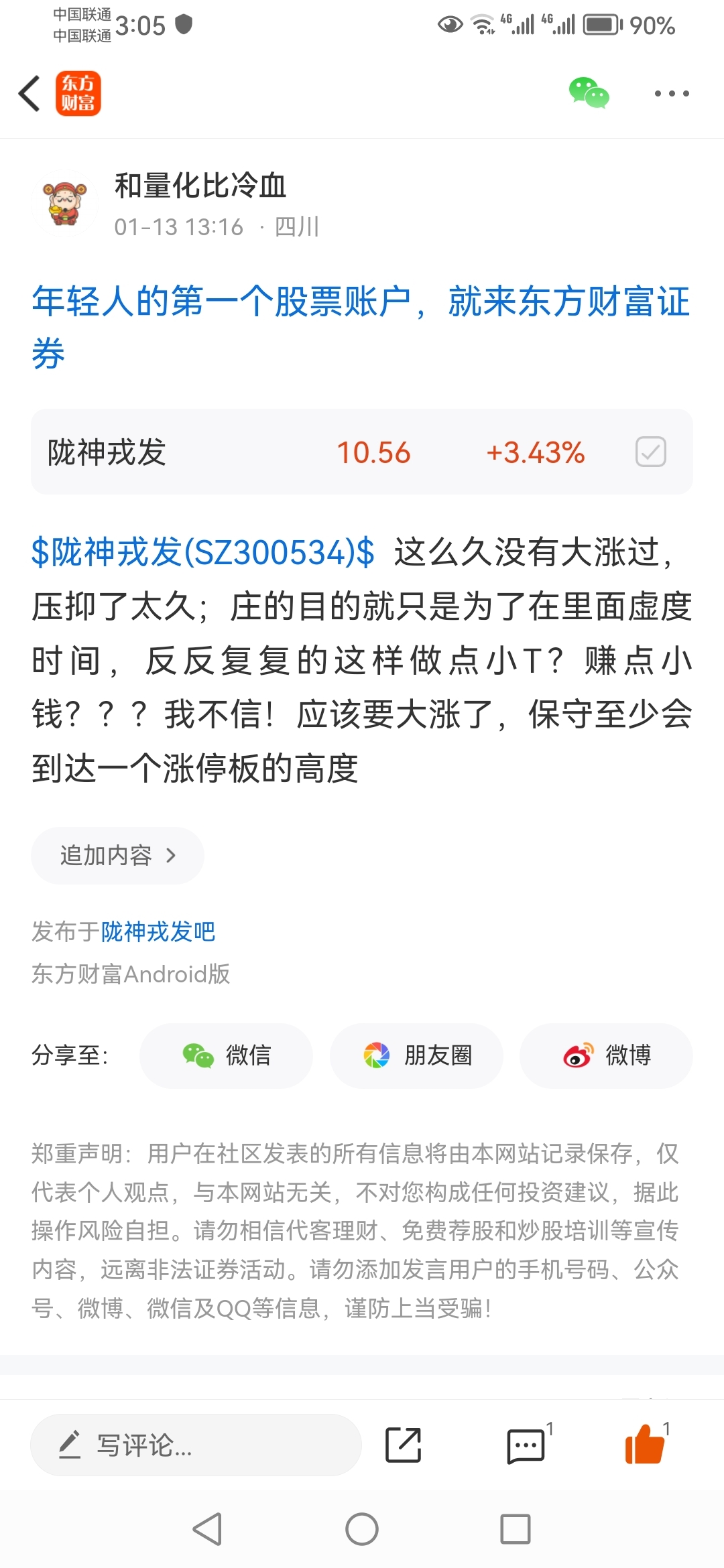 温馨提示: 1.根据《证券法》规定,禁止编造、传播虚假信息或者误导性信息,扰乱证券市场;2.用户在本社区发表的所有资料、言论等仅代表个人观点,与本网站立场无关,不对您构成任何投资建议。用户应基于自己的独立判断,自行决定证券投资并承担相应风险。《东方财富社区管理规定》