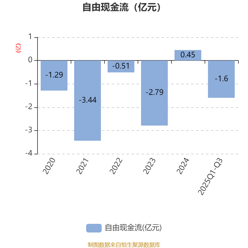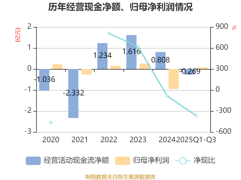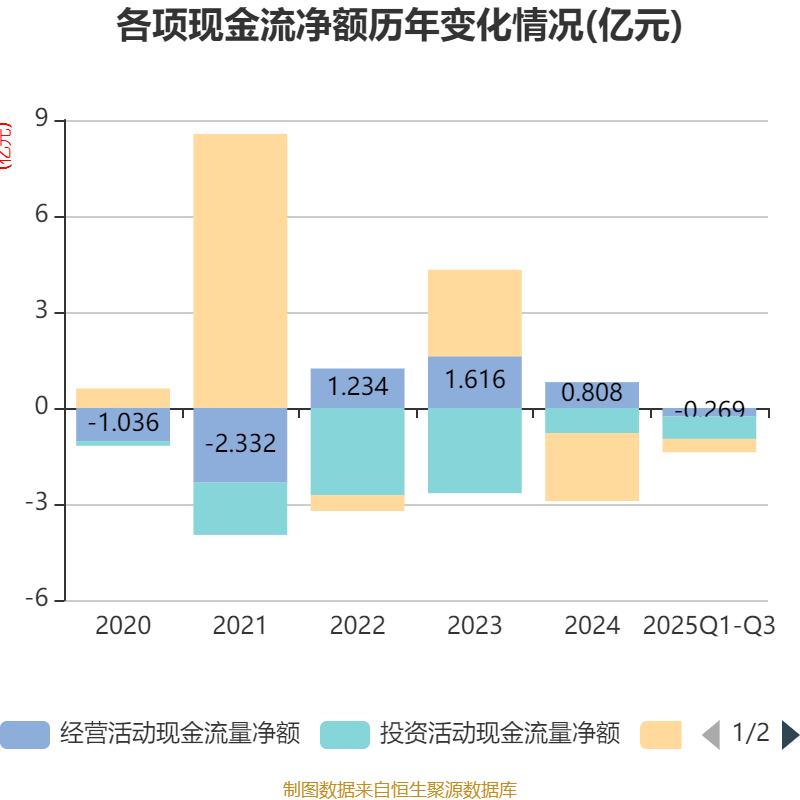 2025年前三季度,公司经营活动现金流净额为-2692.91万元,同比减少6758.77万元;筹资活动现金流净额-4161.43万元,同比增加2.37亿元;投资活动现金流净额-6972.09万元,上年同期为-8104.13万元。