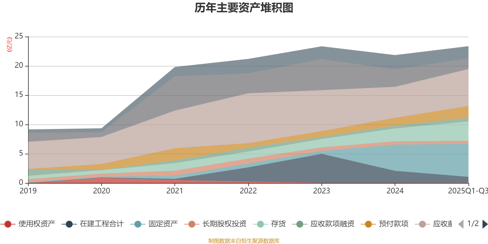 资产重大变化方面,截至2025年三季度末,公司货币资金较上年末减少39.83%,占公司总资产比重下降5.96个百分点;在建工程合计较上年末减少51.4%,占公司总资产比重下降5.04个百分点;存货较上年末增加50.57%,占公司总资产比重上升4.08个百分点;固定资产较上年末增加25.14%,占公司总资产比重上升3.5个百分点。