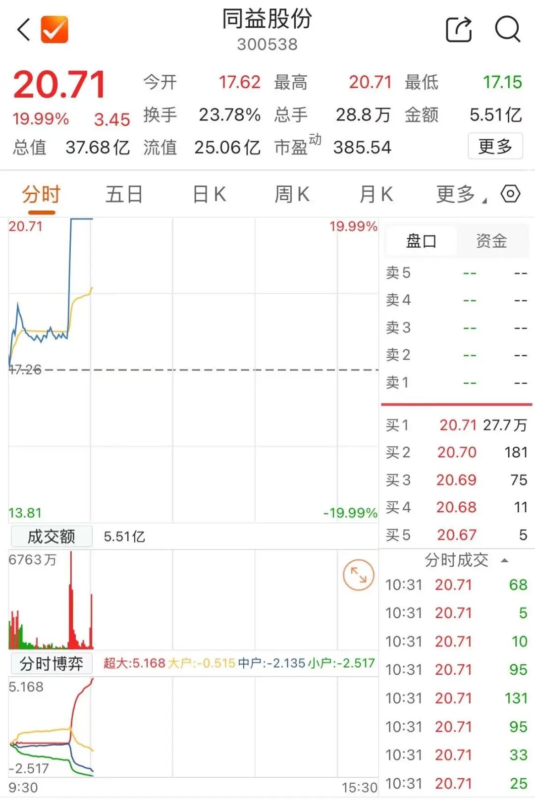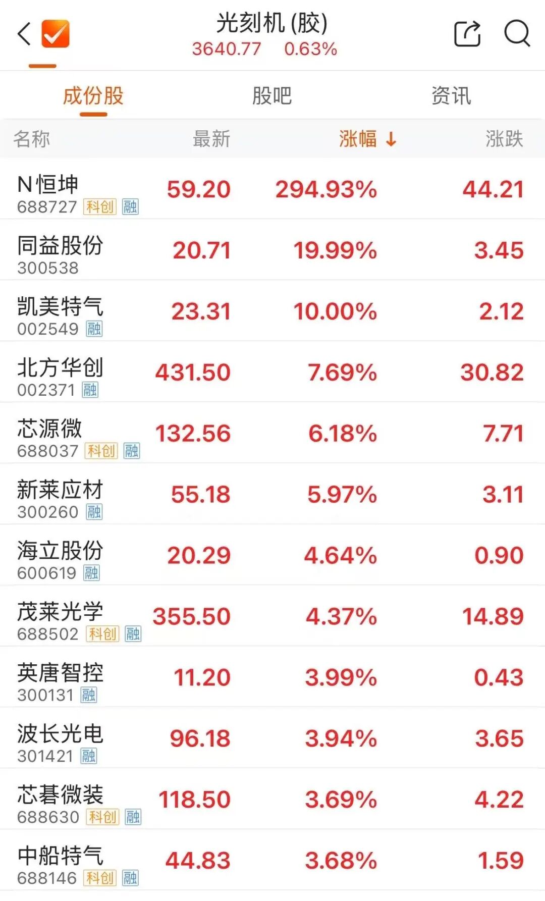 光刻胶概念盘中异动,同益股份(300538)“20cm”涨停,凯美特气涨停,北方华创、新莱应材、茂莱光学、张江高科等跟涨。