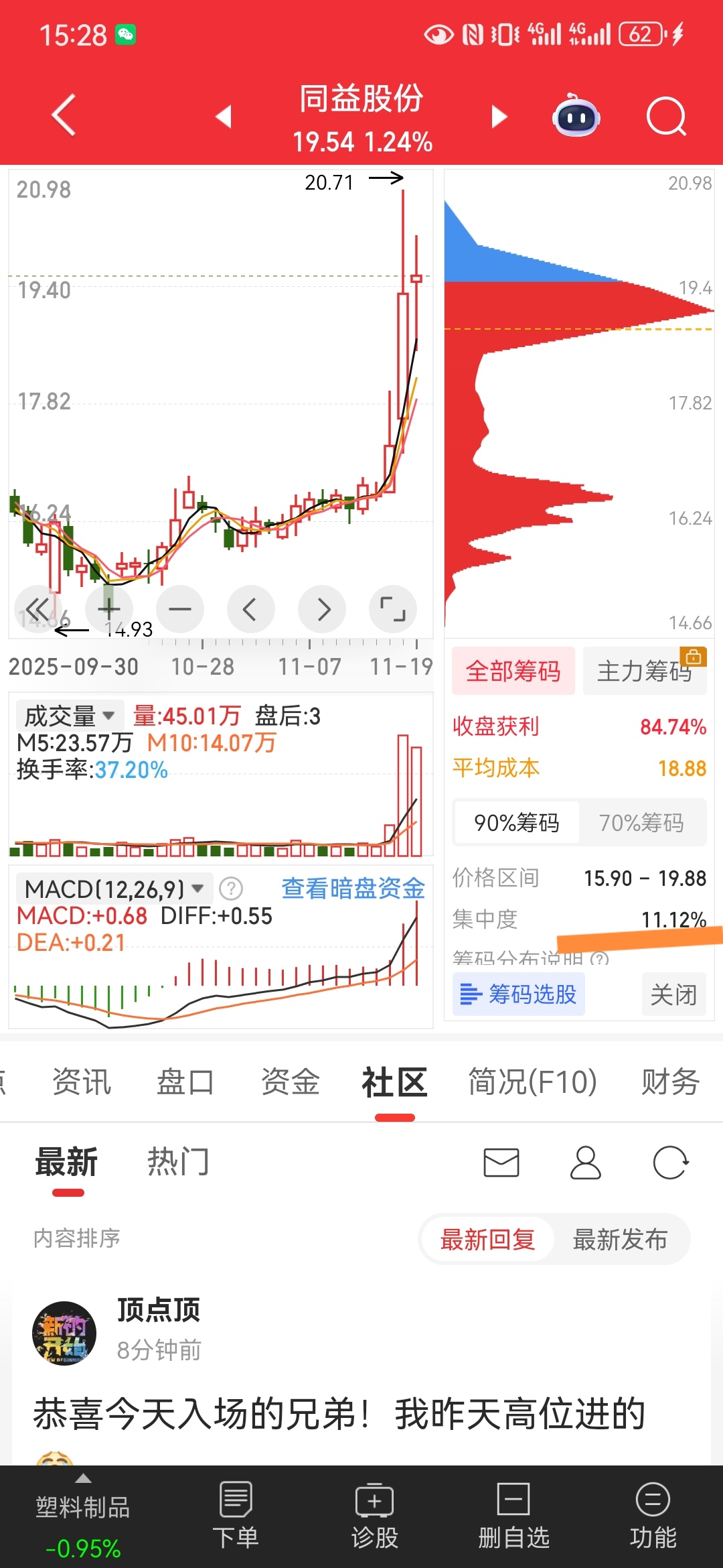 昨天涨停板20.71,解放前期套牢盘20.5,主力真男人