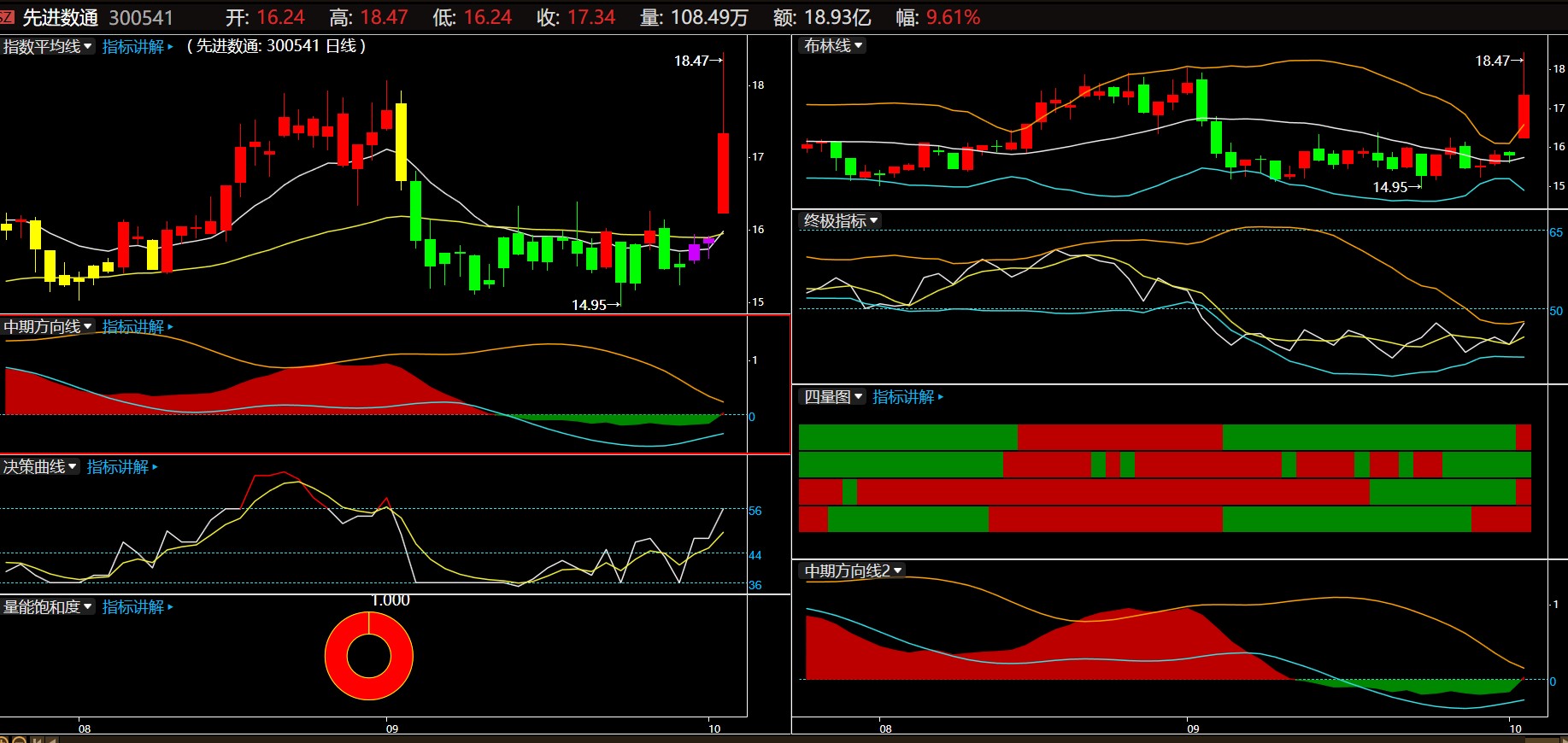 先进数通300541放出半年来最大成交量,同时布林线完美张口突破上轨,明天继续将