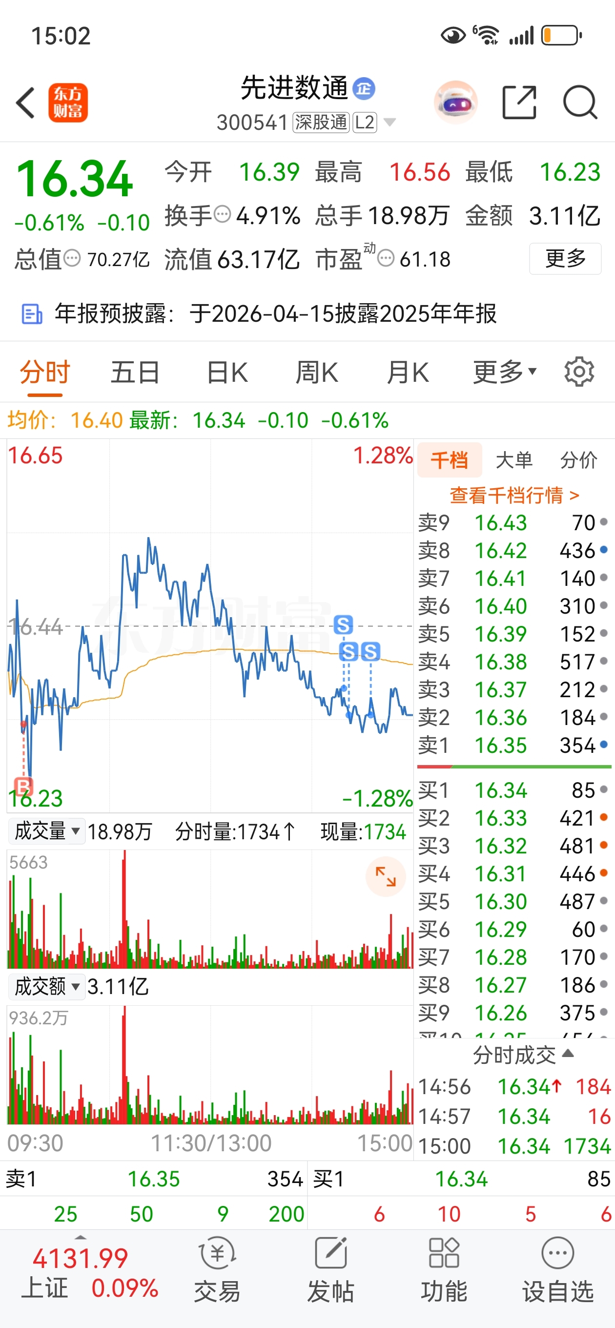 $先进数通(SZ300541)$ 连续两日上摸16.56后回落,已出清大部分仓位,坐等回调一些再入
