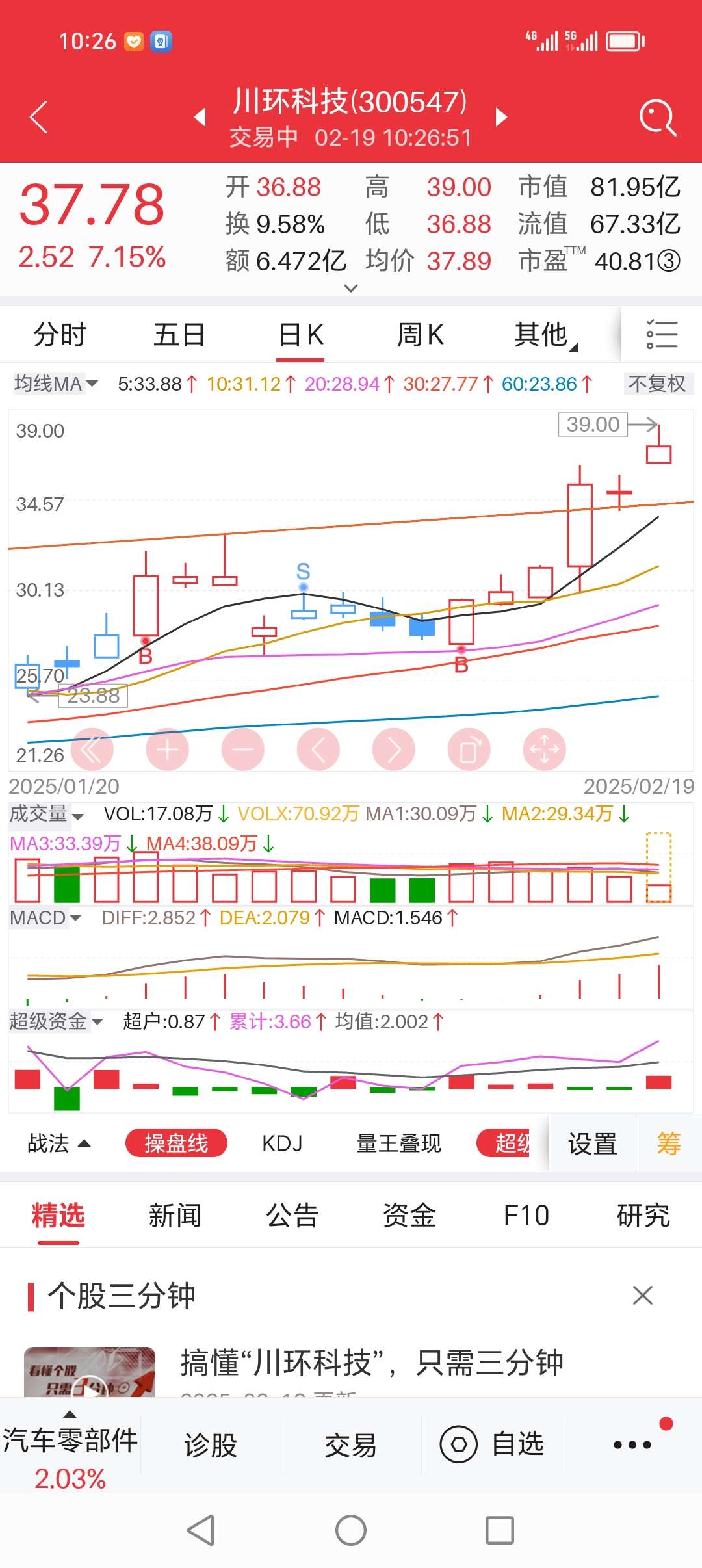 前天感觉不能突破上升趋势线上轨线(34.19附近),在十个多点卖了,结果突破到收盘,昨天回调到线最终收上来没破,压力线变支撑,又买回,收盘四个五分钟有三个是资金买入不少,预估今日开盘不会差,今日竞价也好,我现在九个多点再卖,有点赚就行