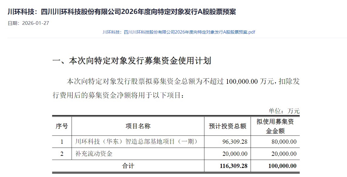 川环科技(300547)1月26日晚间披露2026年定增预案,公司拟向不超过35名特定对象发行股票不超过5422.65万股,不超过发行前总股本的30%,募资总额不超过10亿元,扣除费用后,用于"川环科技(华东)智造总部基地项目(一期)"建设及补充流动资金。