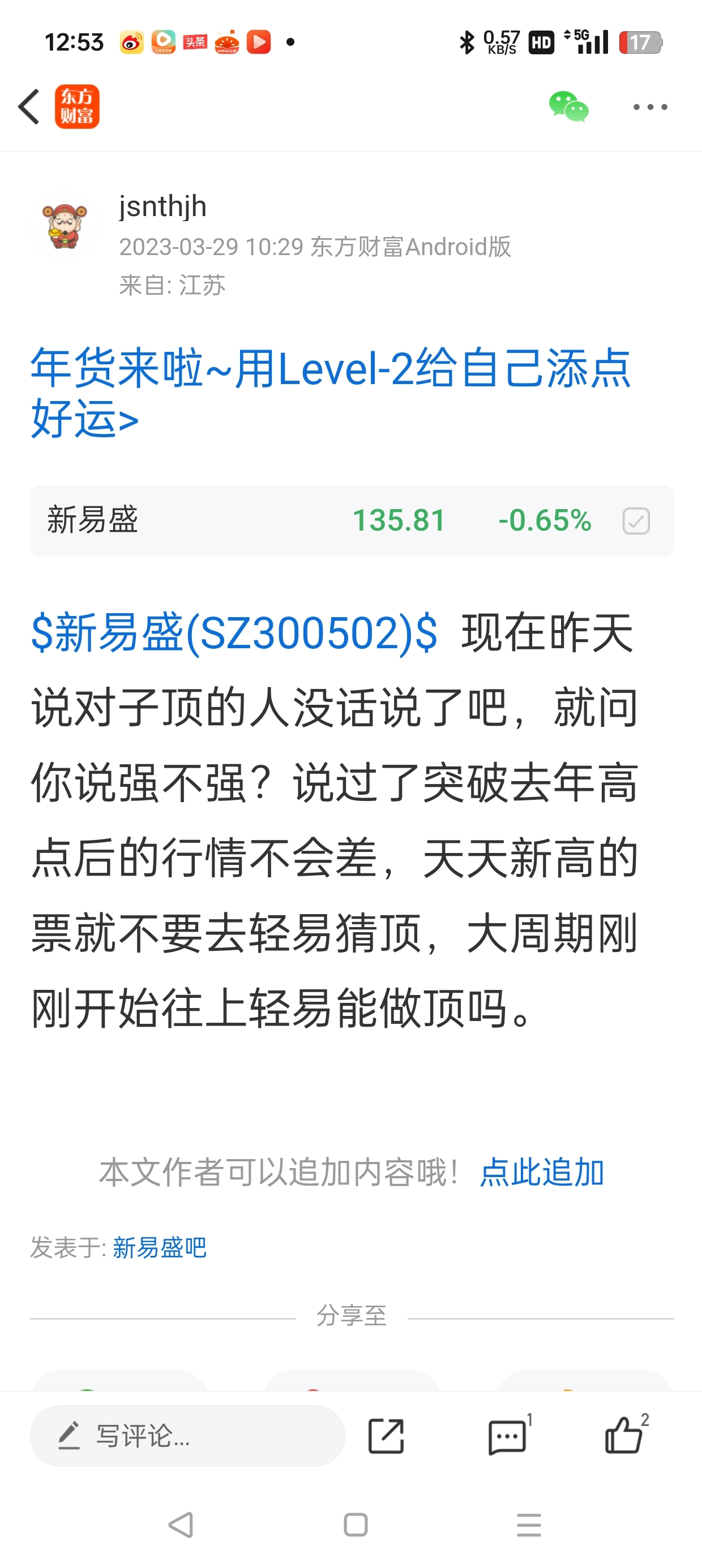 $博创科技(SZ300548)$ 都在说对子顶,这种刚刚突破多年箱体顶部的强趋势票,去猜他对子顶就是,这种价位往往是主力故意挂的做洗盘手段,看看新易胜2023年3月份的对子顶吧。