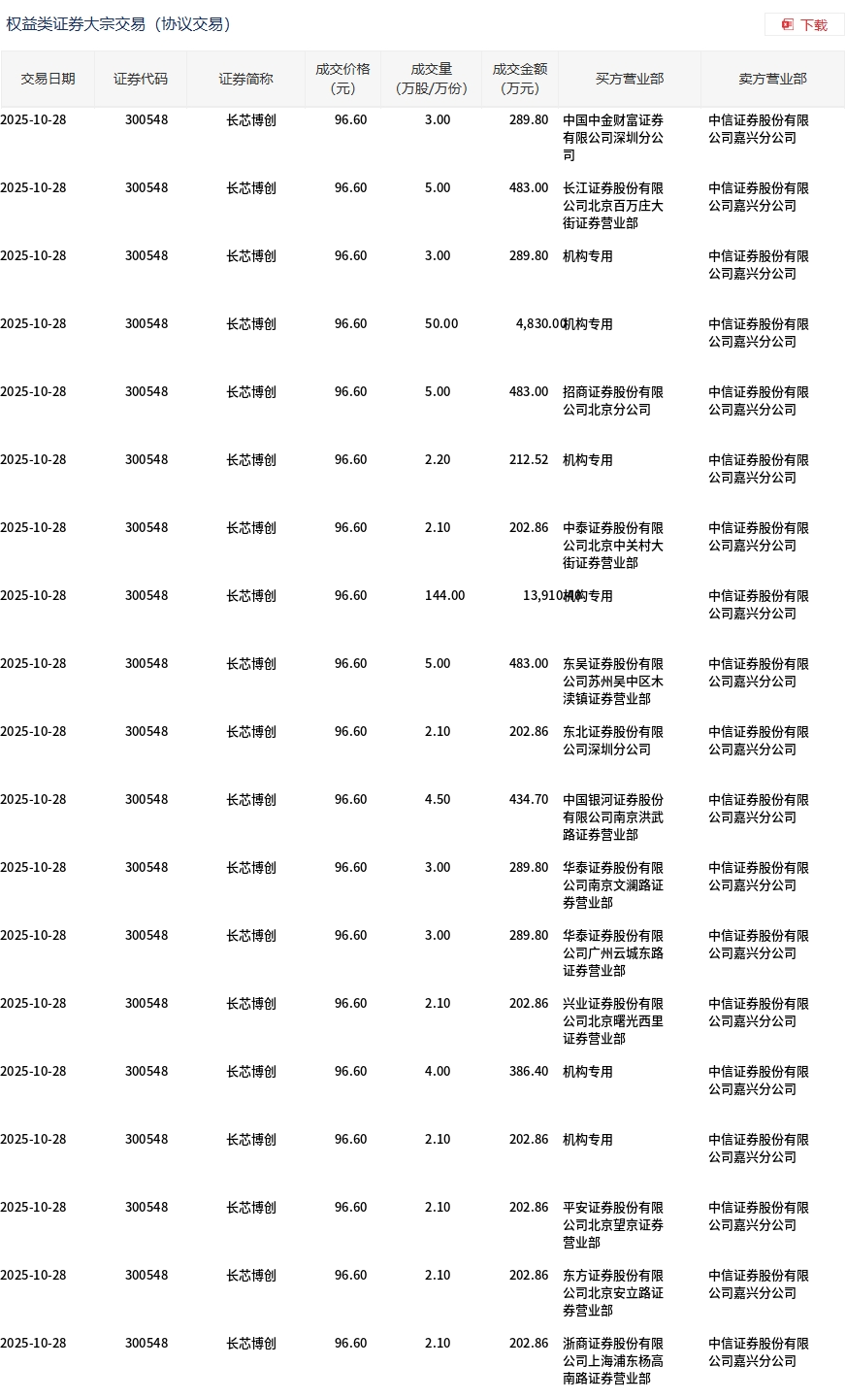长芯博创今日大宗交易折价成交246.4万股,成交额2.38亿元