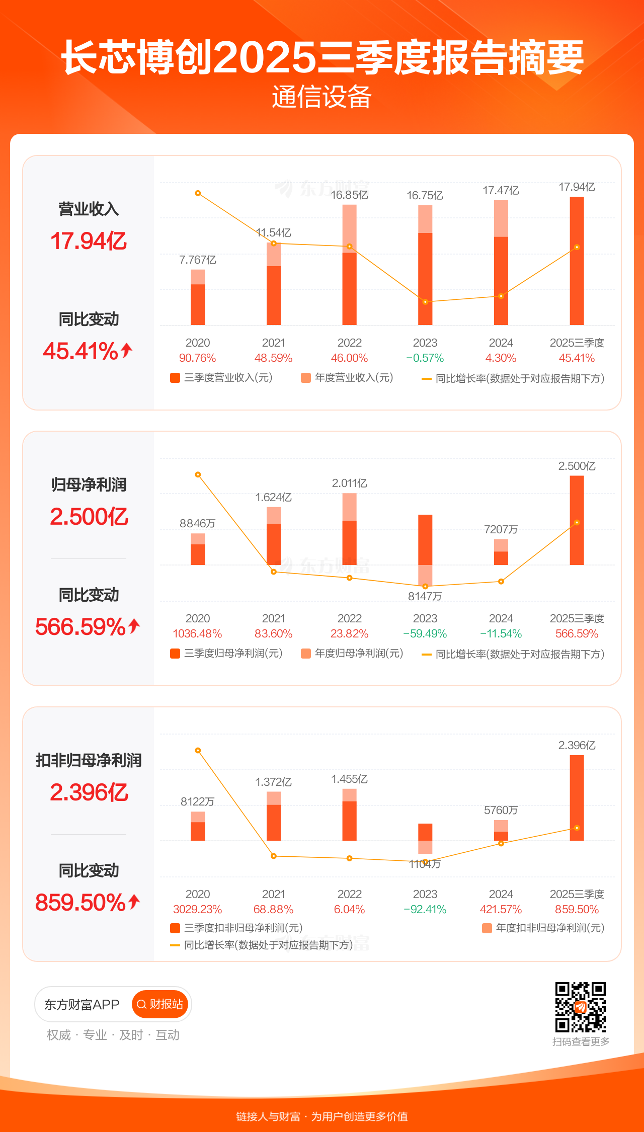 长芯博创10月30日发布2025年三季报显示,公司前三季实现营业收入17.94亿元,同比增长45.41%;归母净利润2.50亿元,同比增长566.59%;扣非归母净利润2.40亿元,同比增长859.50%。