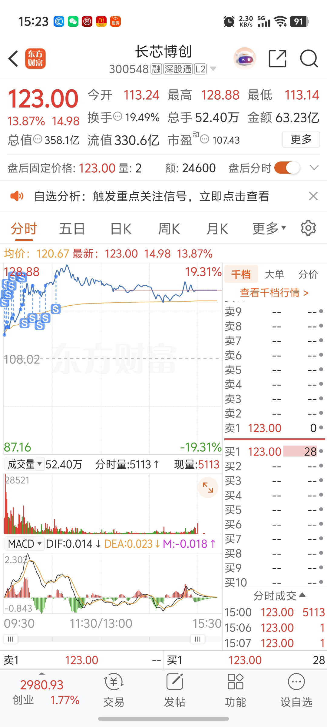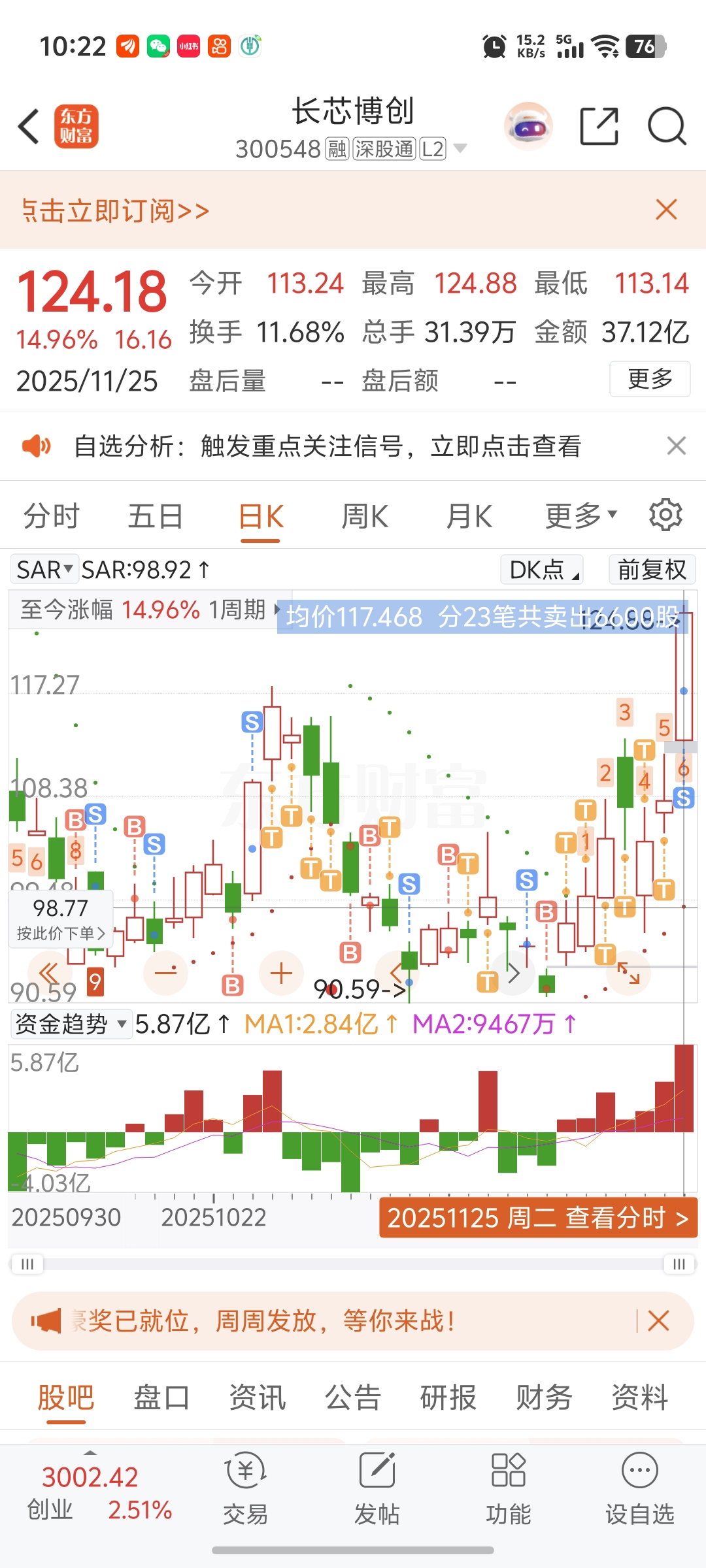 $长芯博创(SZ300548)$ 分批卖,昨天107卖了20w, 今天均价 117就卖光快了,少得十万,蹲了一个月,气的我。