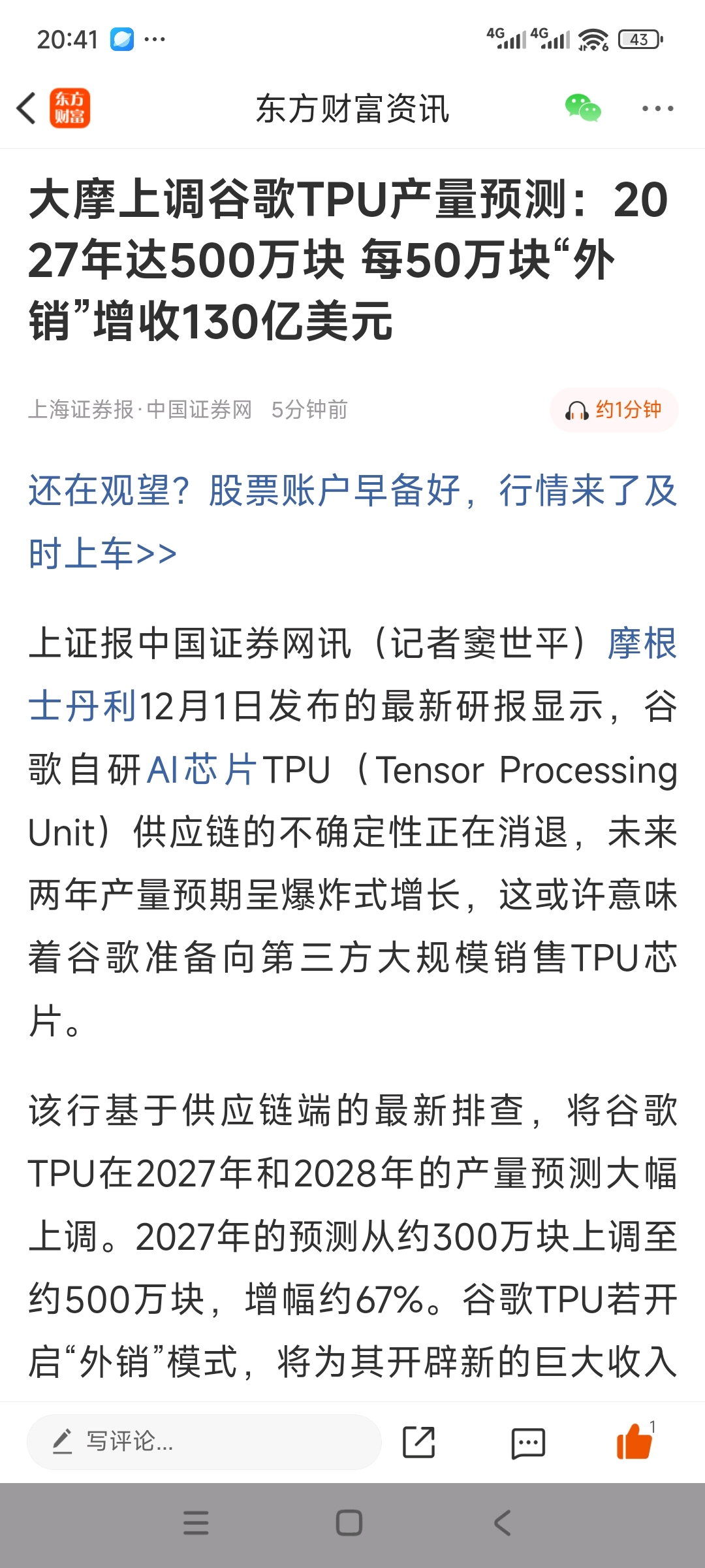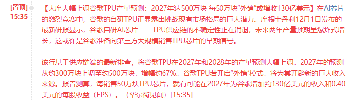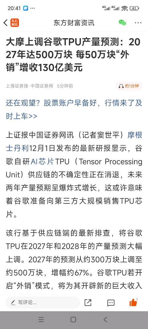 啥意思啊这是!这绝对是超级重磅王炸级利好,甚至可称为 "宇宙级核爆级" 利好,对谷歌。产业链供应链产生全方位、多层次的革命性影响。 产量激增:从 300 万→500 万片,增长 67%,2027 年预测产量 500 万片,远超此前预期的 300 万片,增幅达 67%,2028 年预测产量将突破千万片,年复合增长率超 100%。