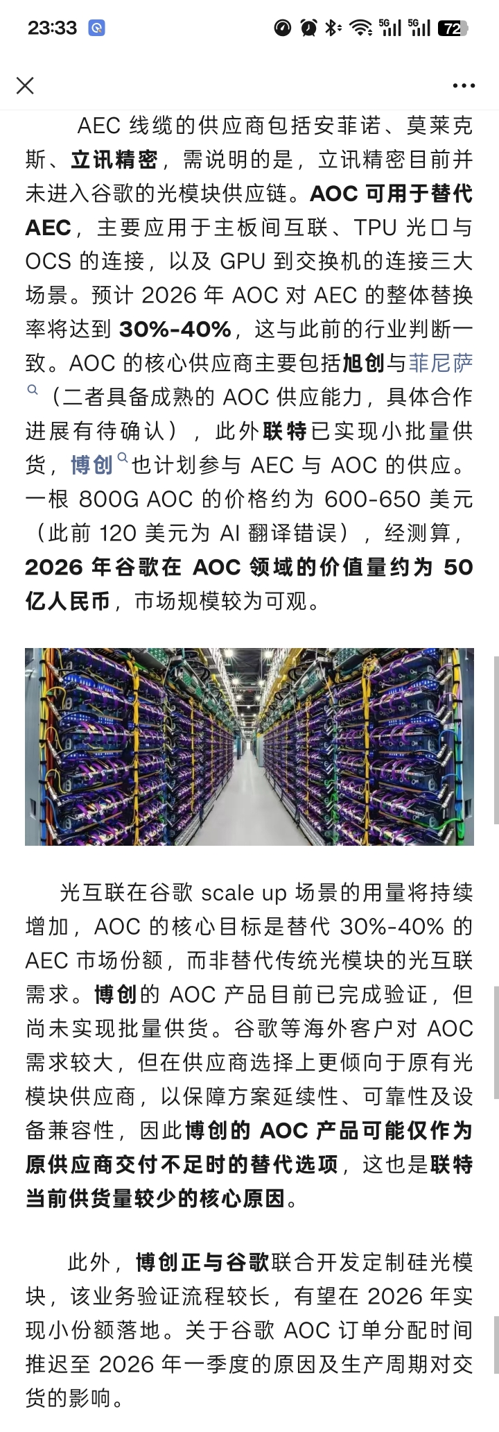 AOC产品已通过谷歌测试验证,但尚未进入批量使用阶段。这主要由于谷歌优先选择现有合作厂家的产品以确保兼容性,今年下半年谷歌协助长芯盛定制研发更高速率性能更佳的硅光模块,2026年一季度aoc/aec等方案会与其配套一起落地,目标20%份额,有机会再造一个博创。