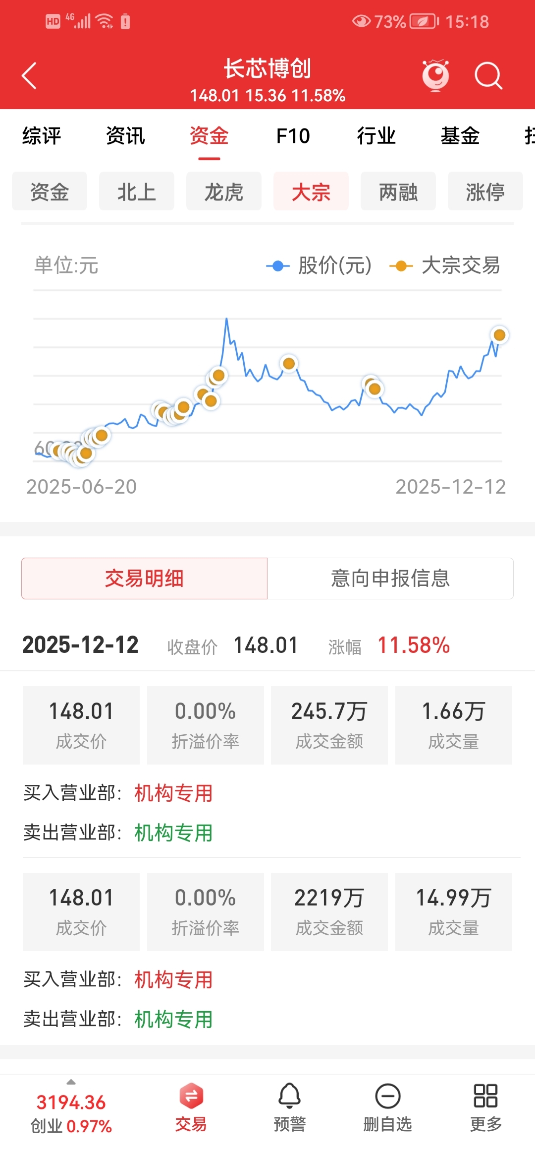 长芯博创12.12号又有2笔大宗交易,成交价是148.01元,买家是机构专用席位