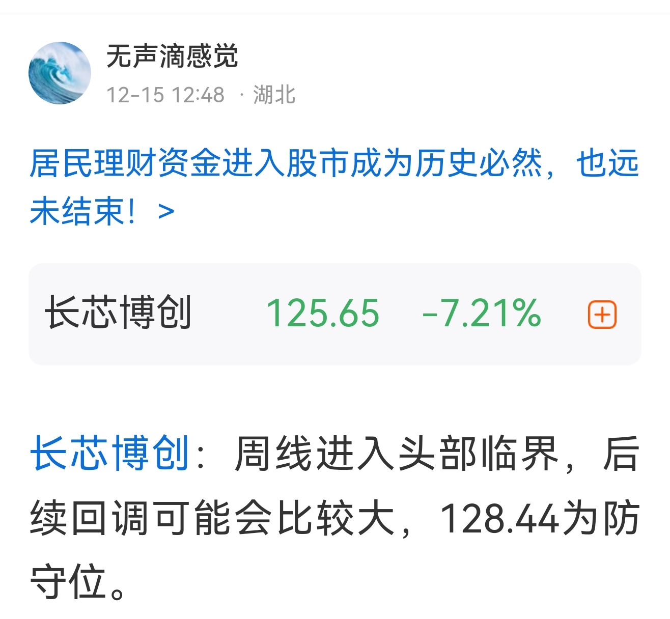 昨天盘中帖子里说:长芯博创:周线进入头部临界,后续回调可能会比较大,128.44为防守位。