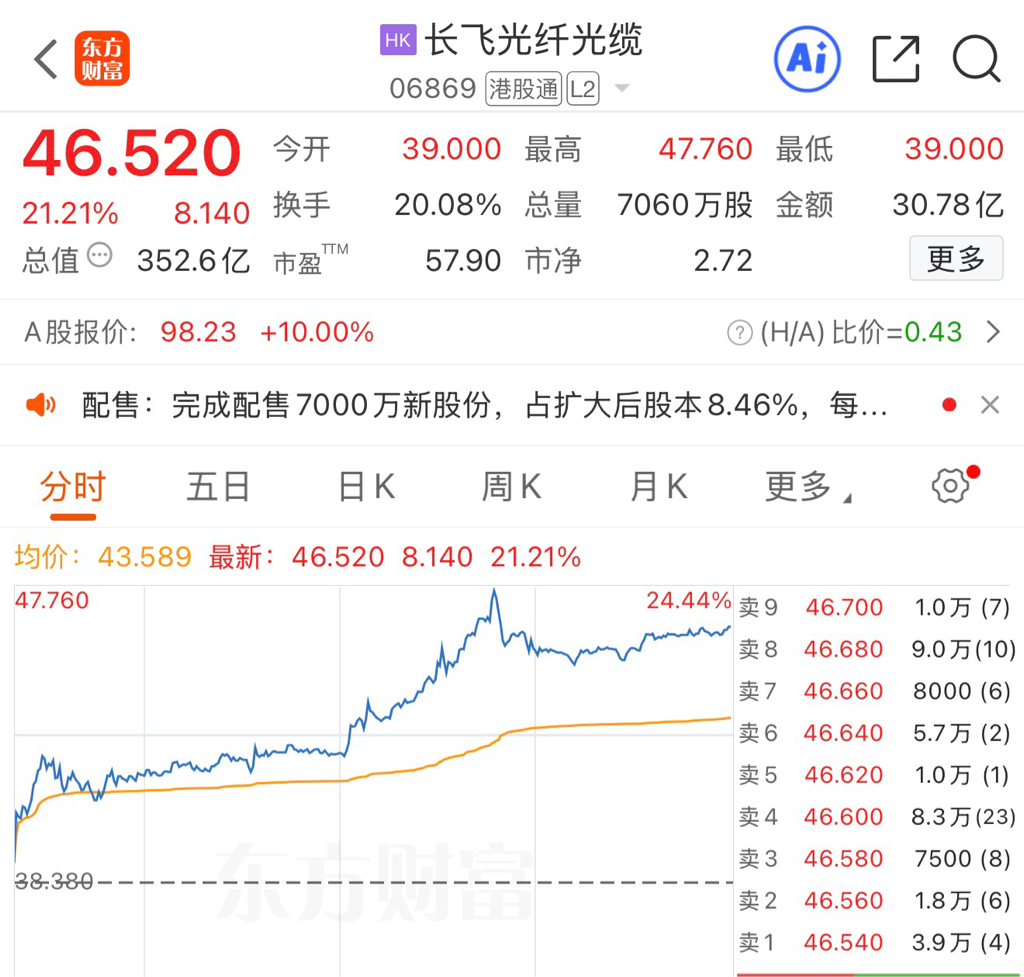 港股长飞光纤涨了21个点,明天A股长飞一字,长芯博创也会大涨