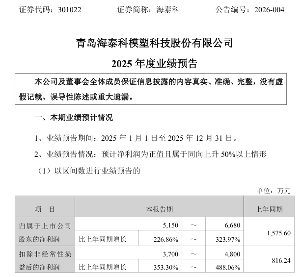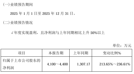 海泰科(301022)1月16日发布业绩预告,预计2025年归母净利润5150万—6680万元,同比增长226.86%—323.97%。报告期内,受益于行业较高景气度及公司首发募投项目产能逐渐释放,公司订单持续增加,驱动营业收入保持稳健增长,利润水平同步提升。