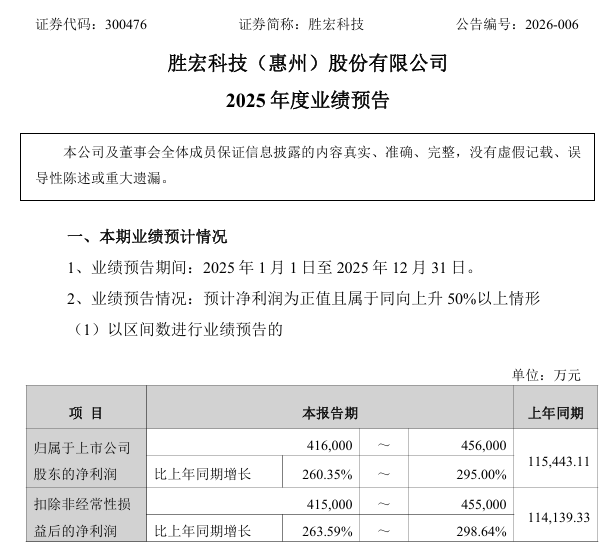 胜宏科技(300476)1月16日发布业绩预告,预计2025年归属于上市公司股东的净利润41.6亿—45.6亿元,同比增长260.35%—295.00%。