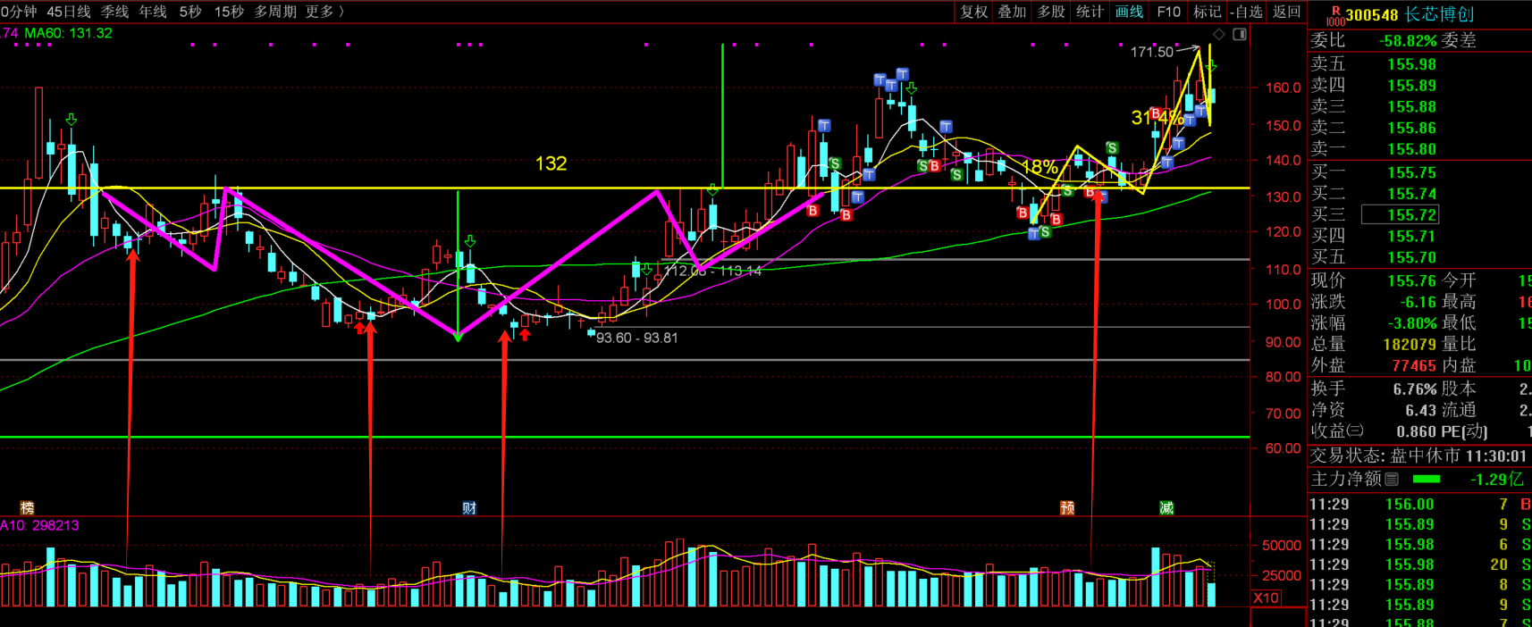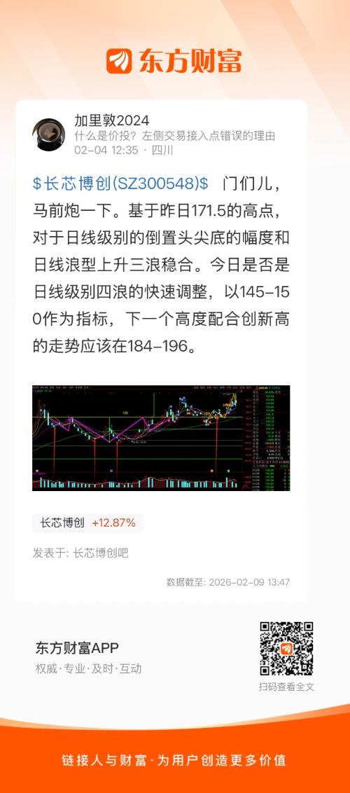 $长芯博创(SZ300548)$ 门们儿,马前炮一下。基于昨日171.5的高点,对于日线级别的倒置头尖底的幅度和日线浪型上升三浪稳合。今日是否是日线级别四浪的快速调整,以145-150作为指标,下一个高度配合创新高的走势应该在184-196。