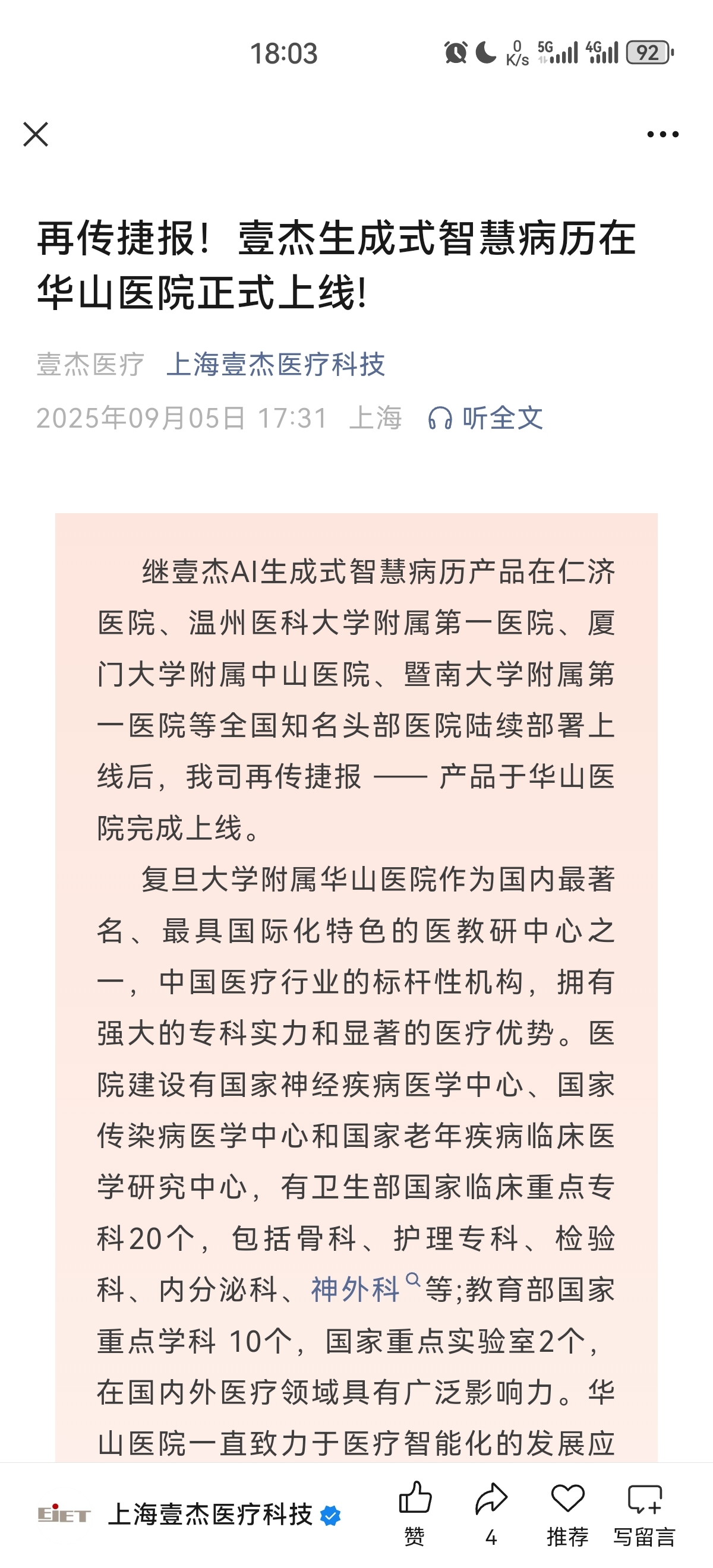 岩山科技子公司岩芯数智人工智能(40%)与上海壹杰科技有限公司(60)出资成立的上海壹杰医疗科技有限公司!利用Yan.大模型智慧生成病历系统已经与多家医院签约合作,项目落地了!