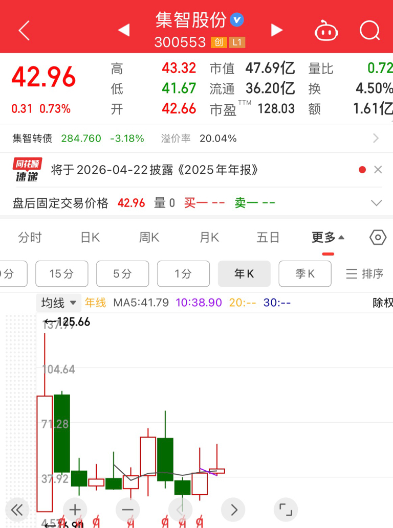 $集智股份(SZ300553)$ 从年K线来看、确实短期不支持上涨、下影下探的太少了、上涨不稳当、应该下探至35元左右差不多。